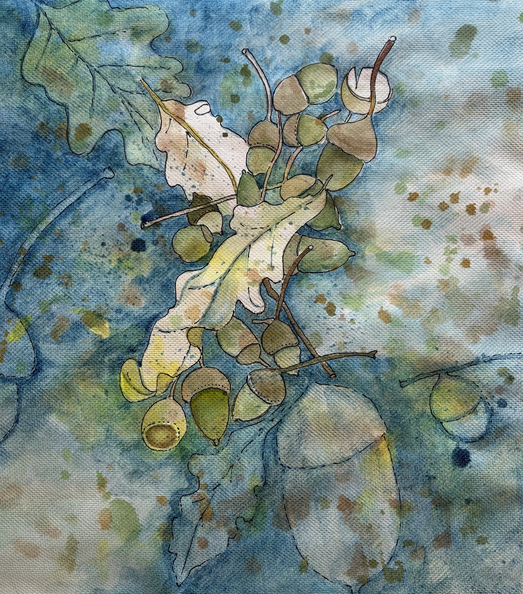 Aquarel Inkt Natuur Zaansbord Kleurig Eikels Eikenblad Bladeren Stilleven Fantasie