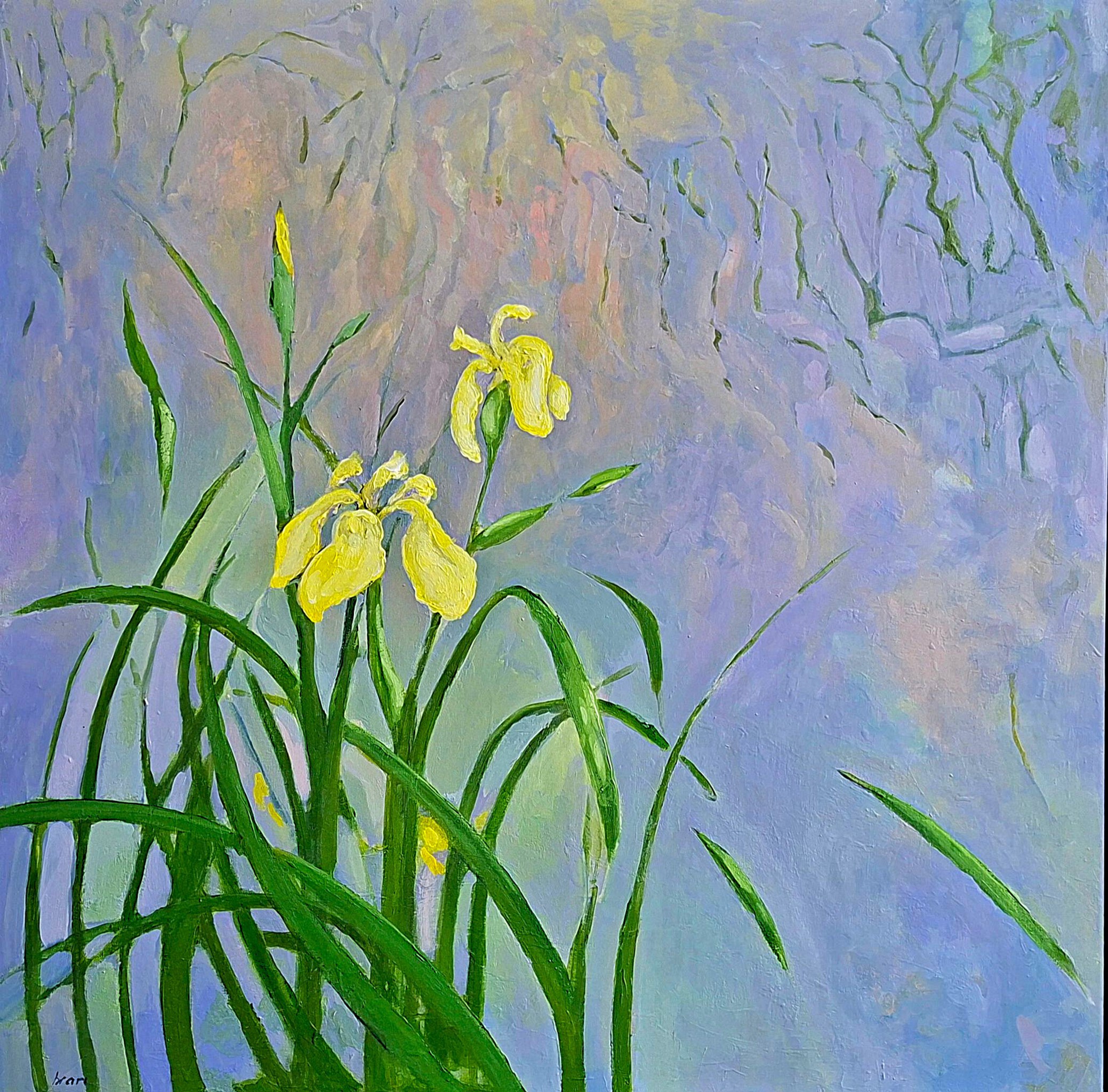 The Yellow Iris. De gele lis geschilderd in een poëtisch decor. Inclusief aluminium lijst