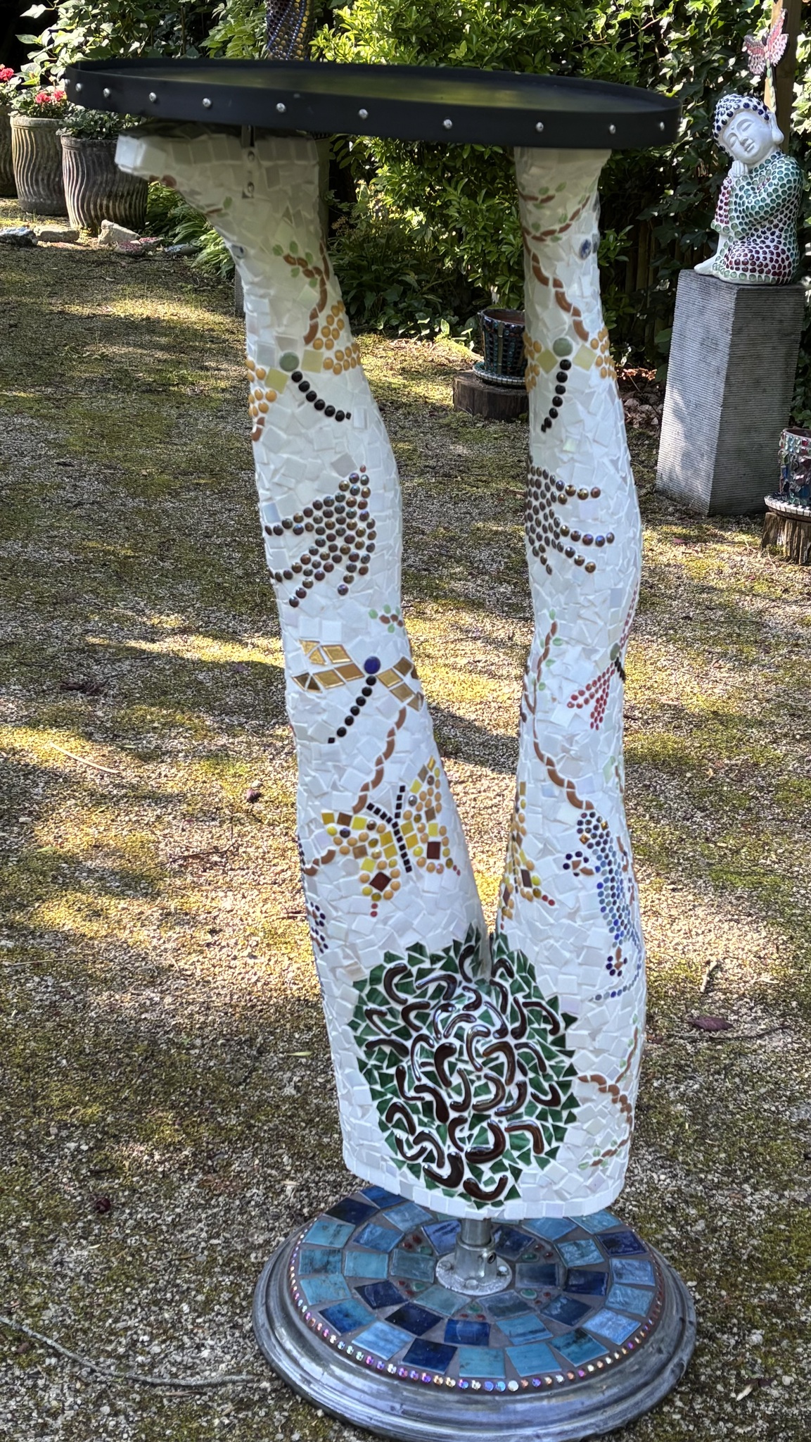 Benen bewerkt met keramische- en glas tegels en glas. Tafel geschikt voor buiten. Keramisch onderstel bewerkt met keramische tegels.