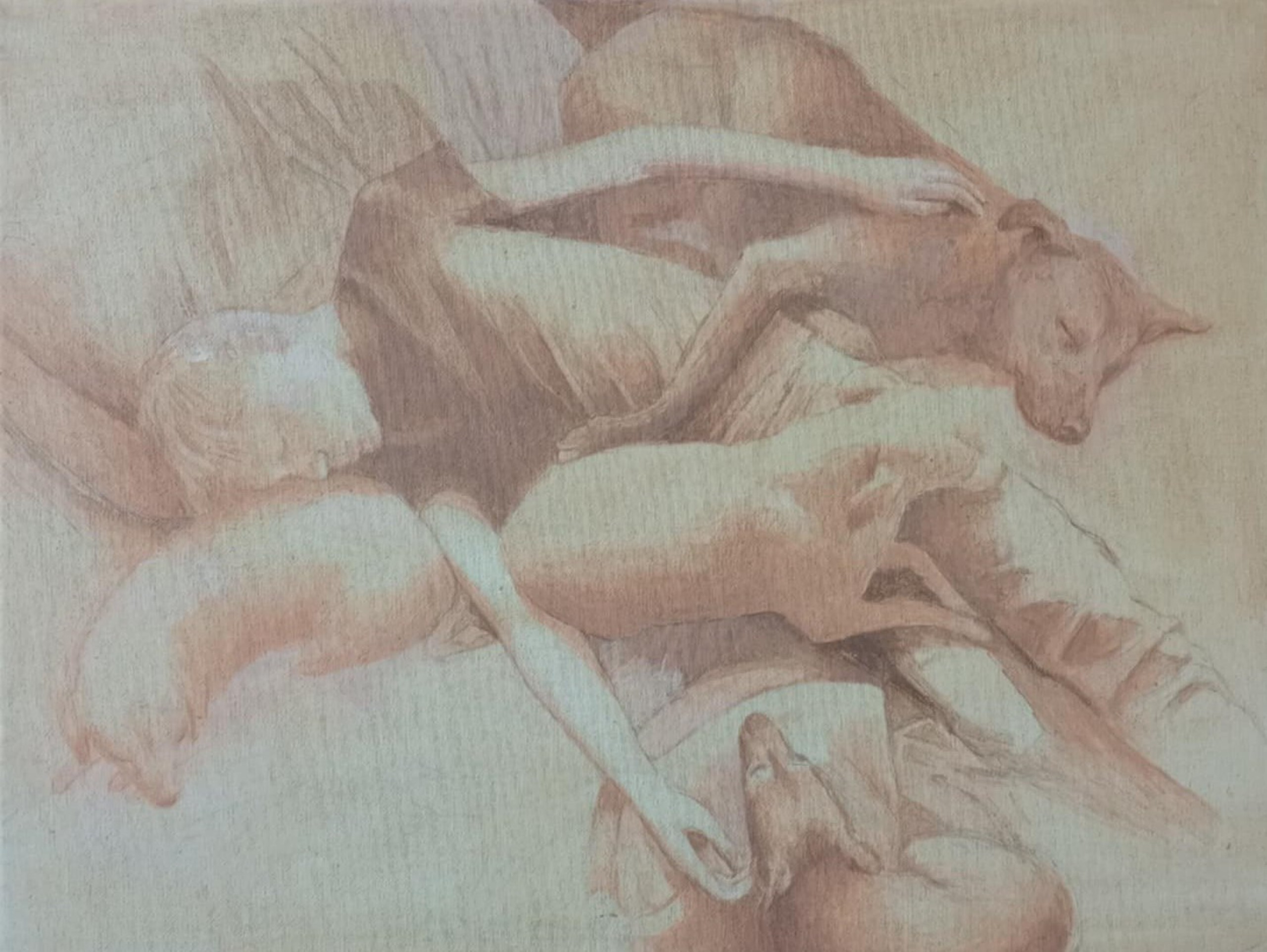 Ben van huis uit portretschilder,niet alleen van mensen - ook van dieren. Wat vaak terugkeert in mijn werk is een kind en hond slapende. Meestal gebruik ik olieverf , soms pastel en krijt.