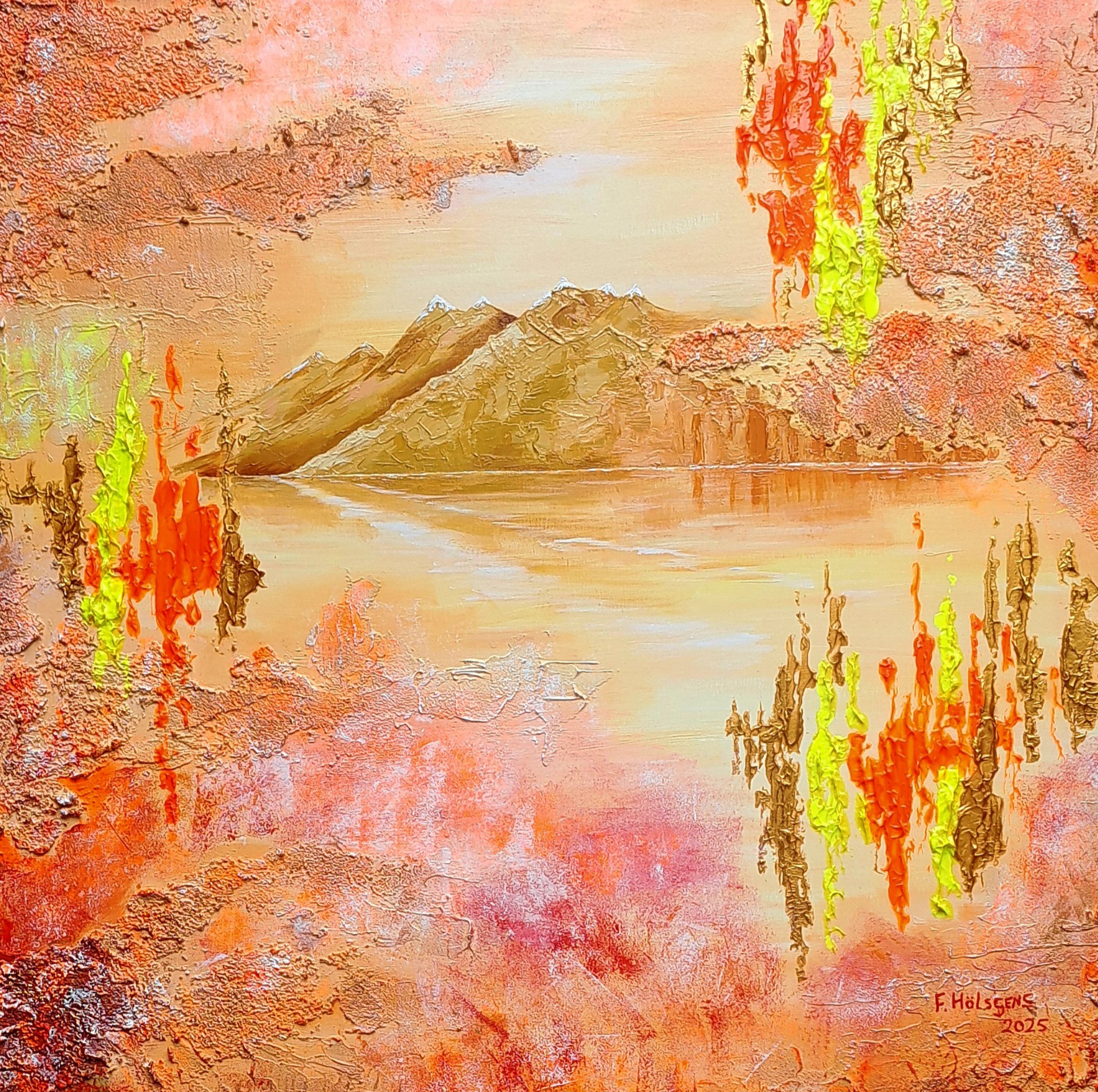 "Like flames" is net als mijn vorige twee doeken een abstract kunstwerk met een licht realistische touch. Het werk is uitgevoerd in warme tinten. Een mix van pastel en de voor mijn werk kenmerkende felle uitspattingen. Een kleurkeuze die ik al een aantal jaren niet meer maakte maar die hier verrassend sterk overkomt. Een werk met veel diepte, een gesuggereerde fantasiewereld waar je bijna ingezogen wordt. Ik heb wederom gebruik gemaakt van diverse structuurmaterialen.