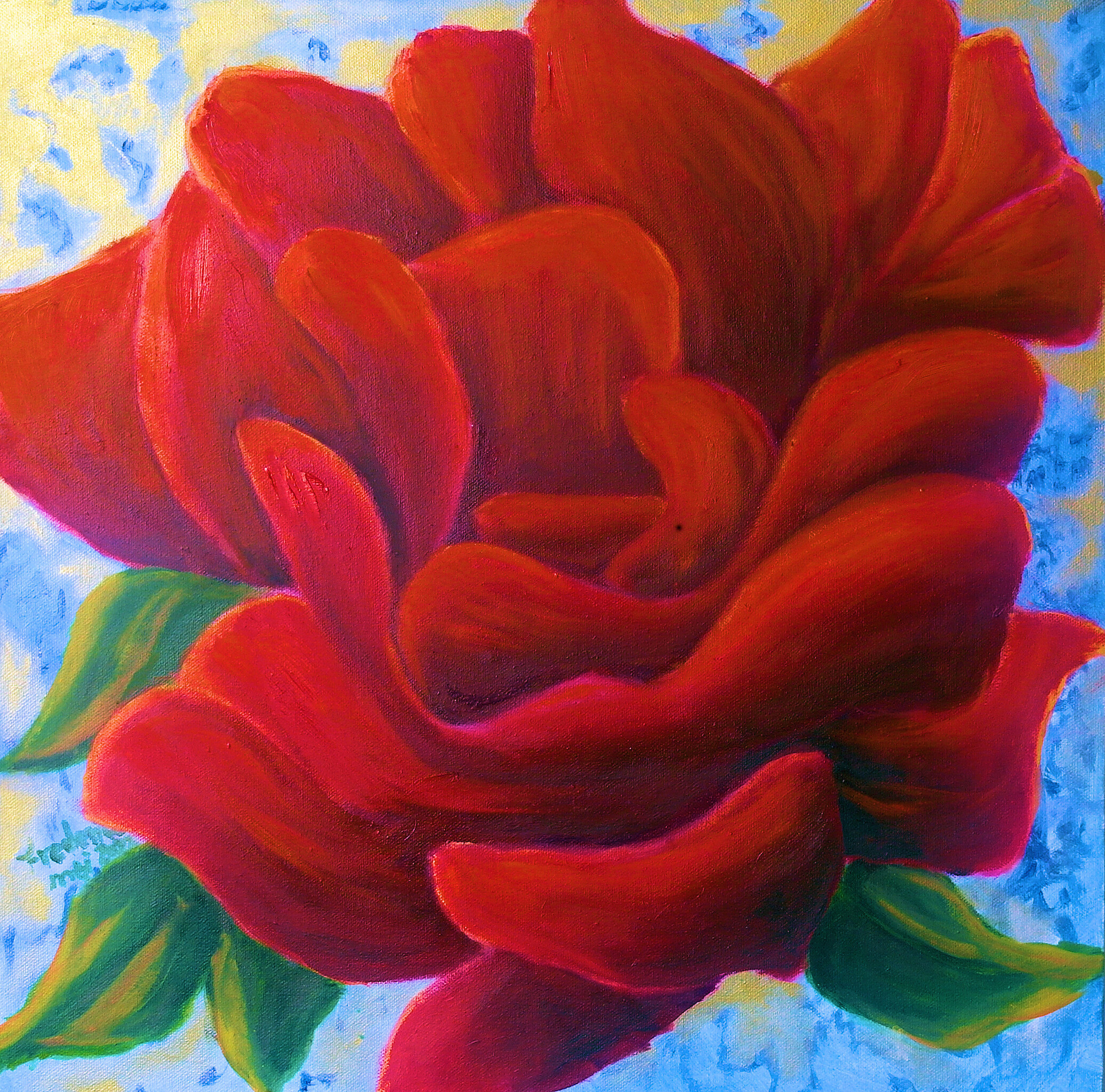 Een betoverend olieverfschilderij van een dieprode roos in volle bloei, met fluweelzachte blaadjes die zich elegant ontvouwen. Tegen een dromerige achtergrond van hemelsblauw en goud straalt de bloem warmte, liefde en tijdloze schoonheid uit. Een romantisch en rustgevend kunstwerk dat elke ruimte verrijkt.
