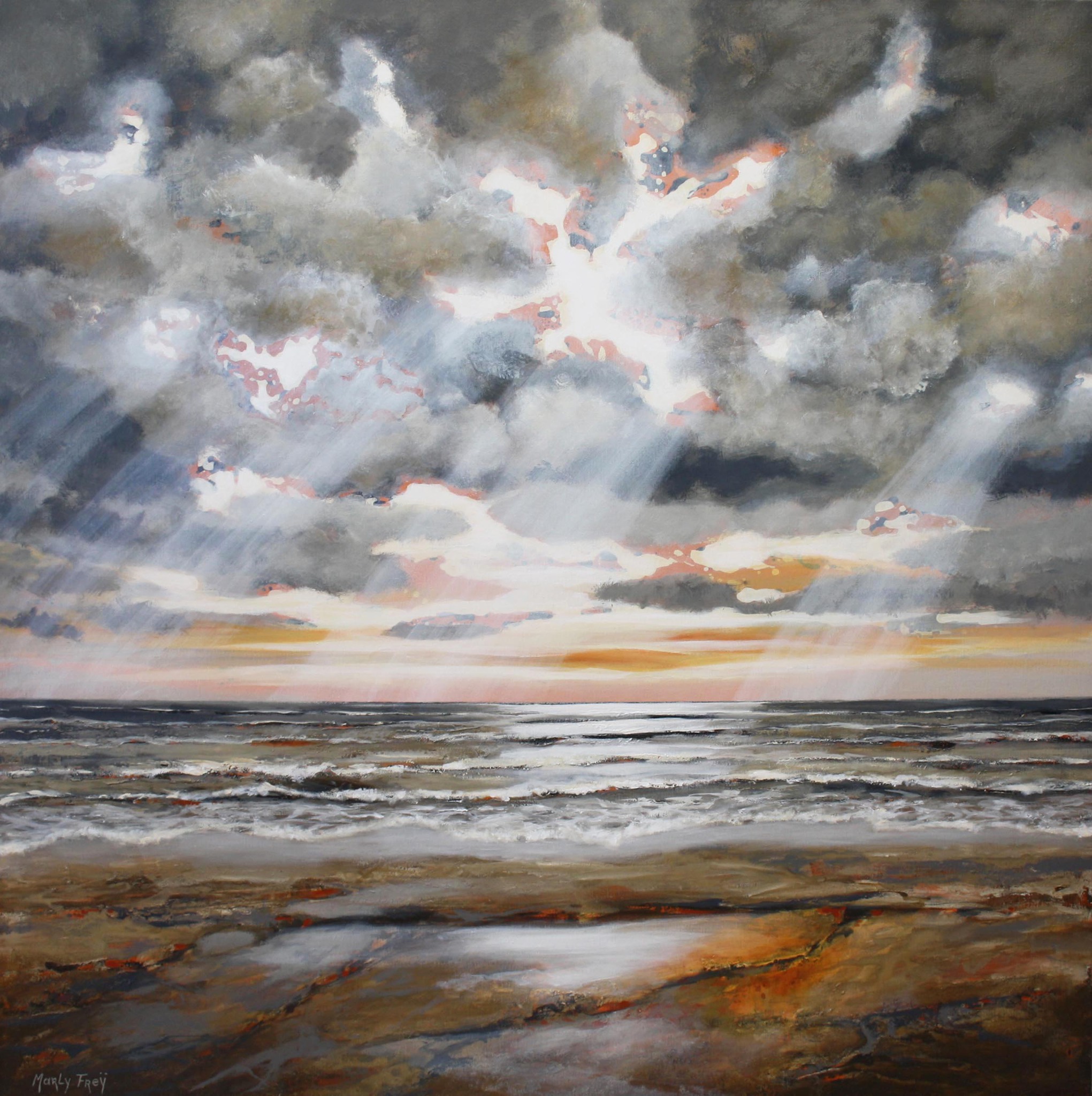 Marly Freij maakt grote kleurrijke, maar ook meer ingetogen schilderijen in gemengde techniek, met name sferische landschappen en abstracte composities