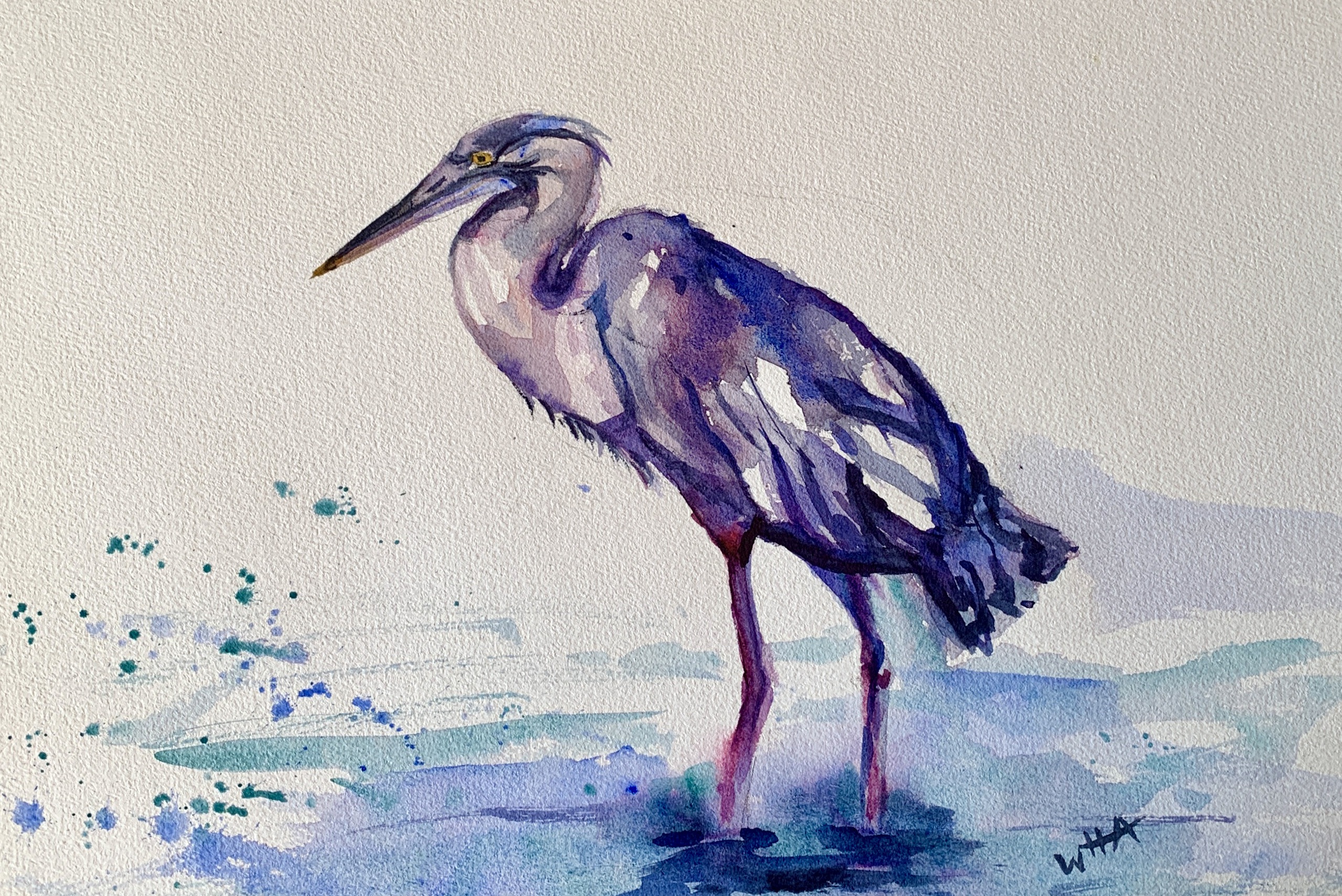 De blauwe reiger is het symbool van Vianen, het stadje waar ik woon. Hij wordt hier dan ook dagelijks gespot. reden genoeg om hem te schilderen.