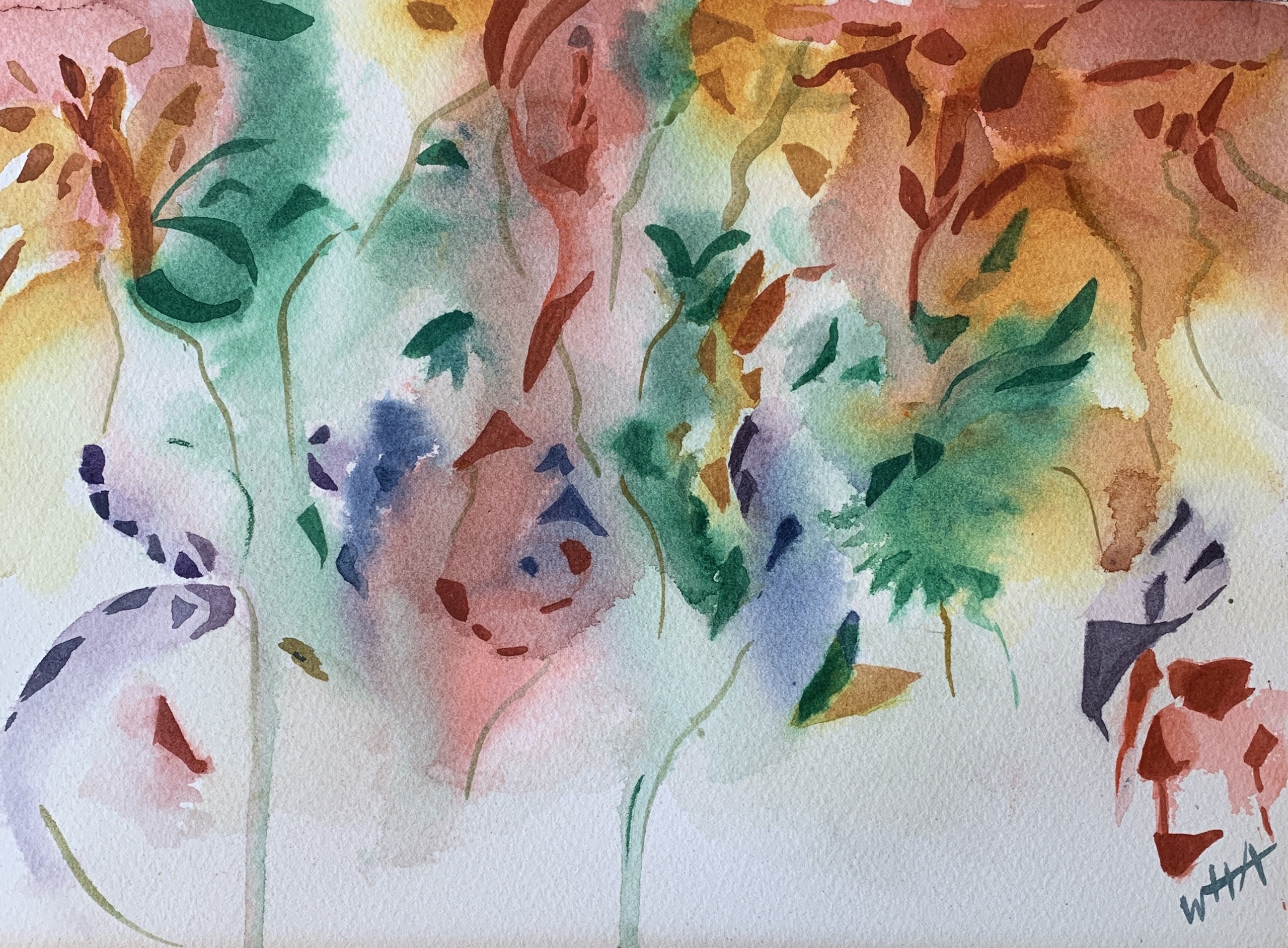 Door te spelen met zachte en harde overgangen en gebruikmakend van wit ruimtes en warme kleuren is deze aquarel ontstaan