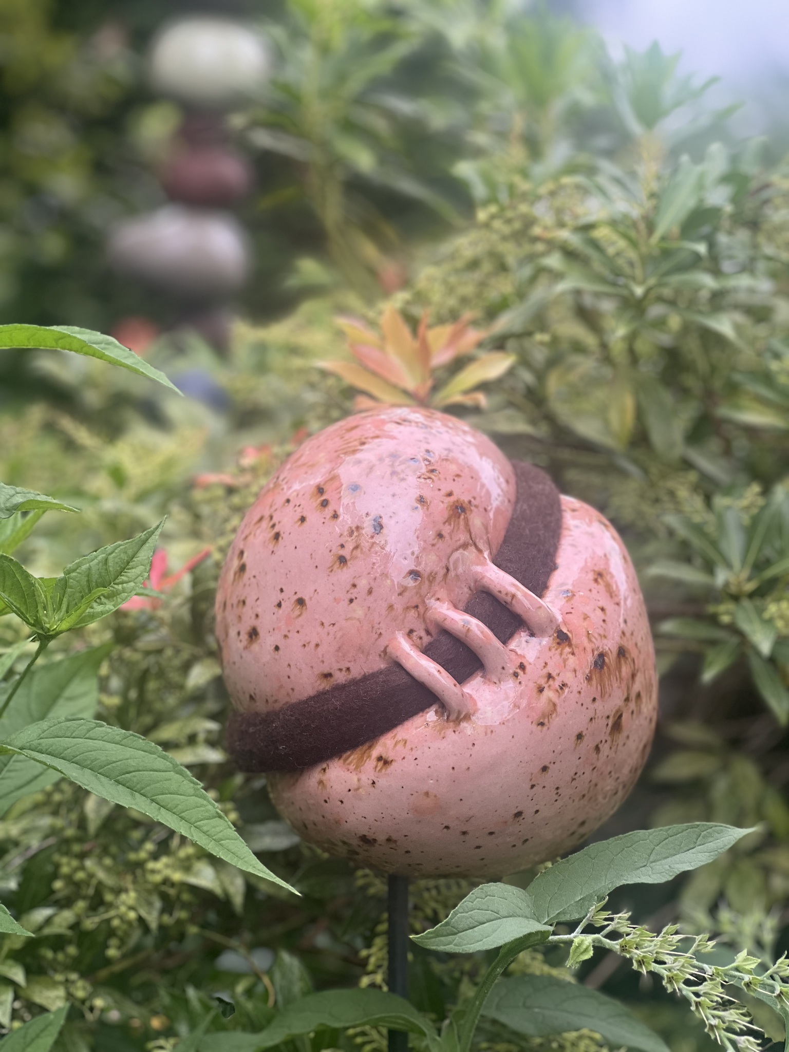 Keramiek, steengoed, geglazuurd. Band van vilt.