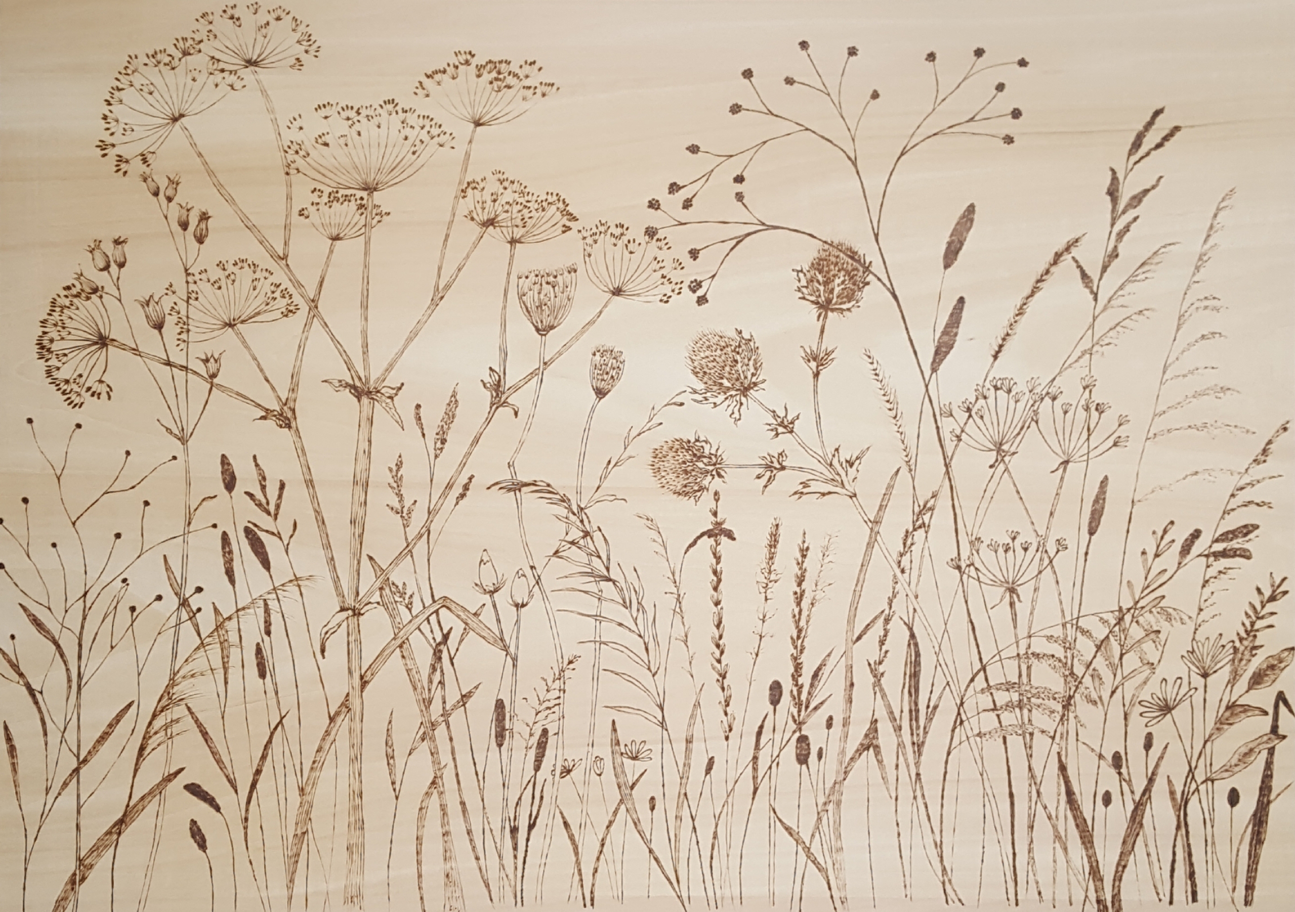 Pyrografie, brandschilderen op lindenhouten paneel.