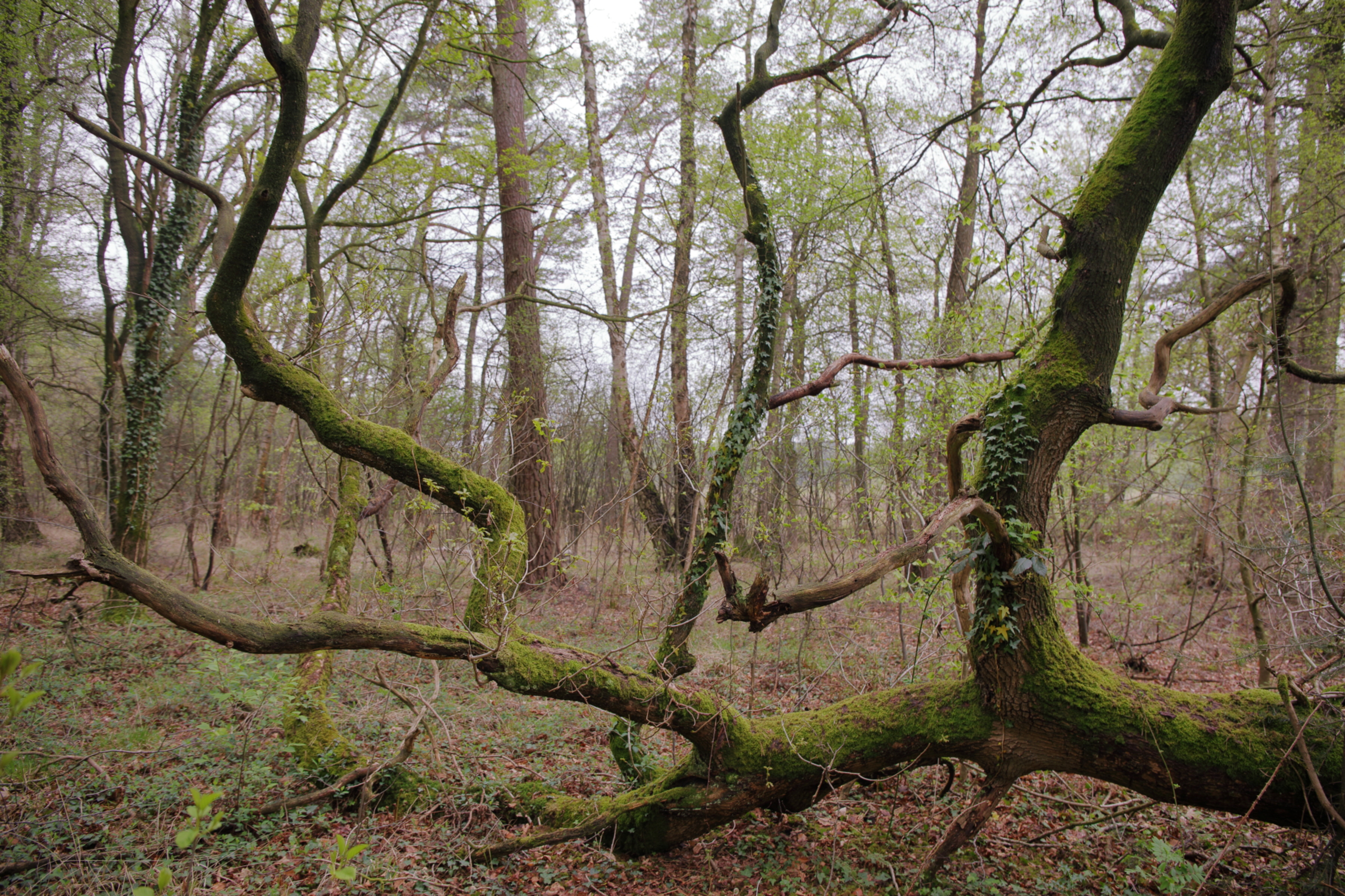 takken van een omgevallen eik die naar de lucht lijken te wijzen. De achtergrond is wat onscherp om voorgrond en achtergrond "los" te maken. je verwacht elk ogenblik dat er wat gaat komen of je voelt dat er wat extra is maar het is er niet. het is maar hoe het op je af komt.