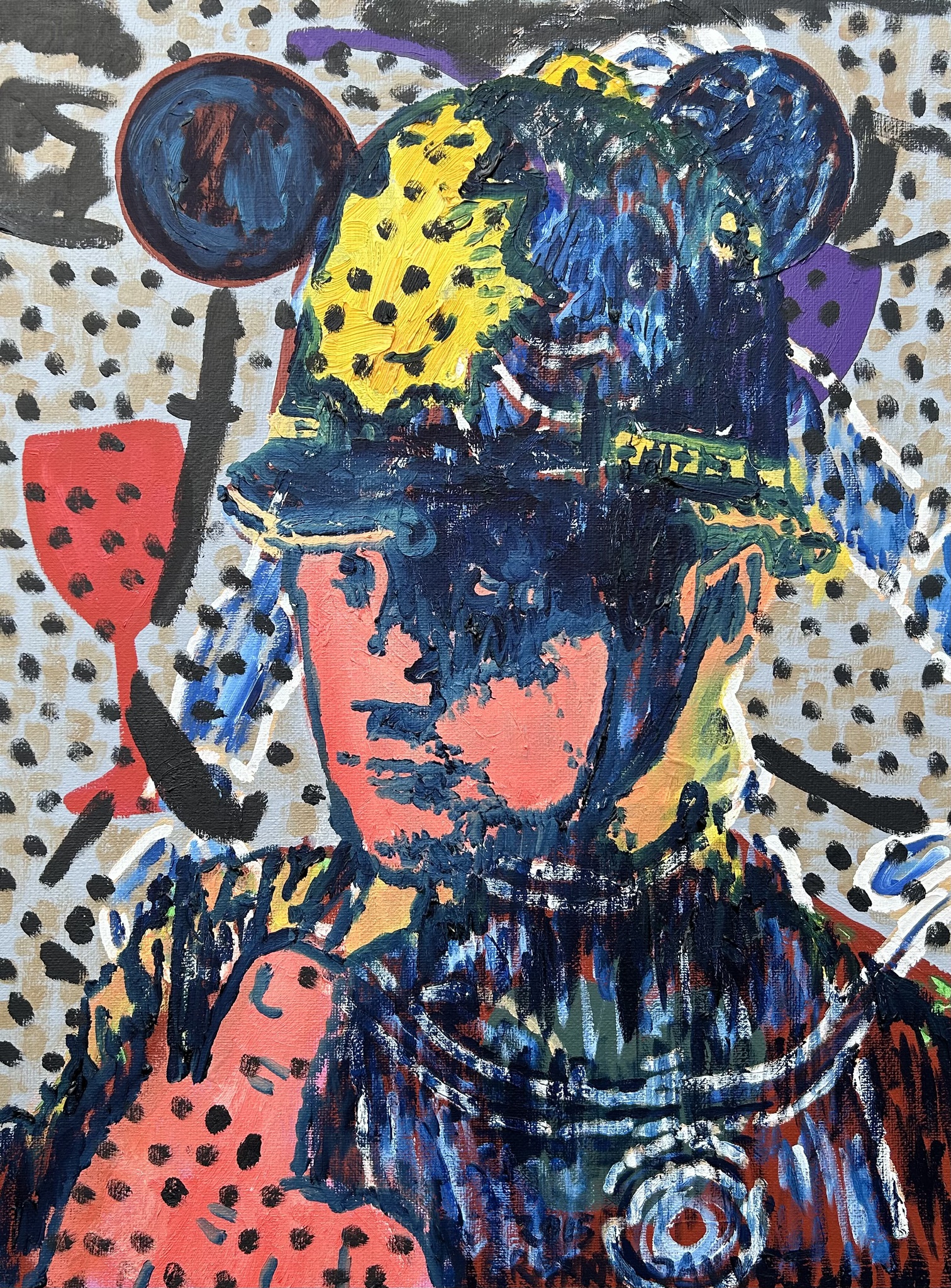 2015 Lekker fietsen maar dan, wat gebeurt er. Ongepast gedrag in het verkeer. Geschilomet olieverf. Popart en Banksy geïnspireerd.