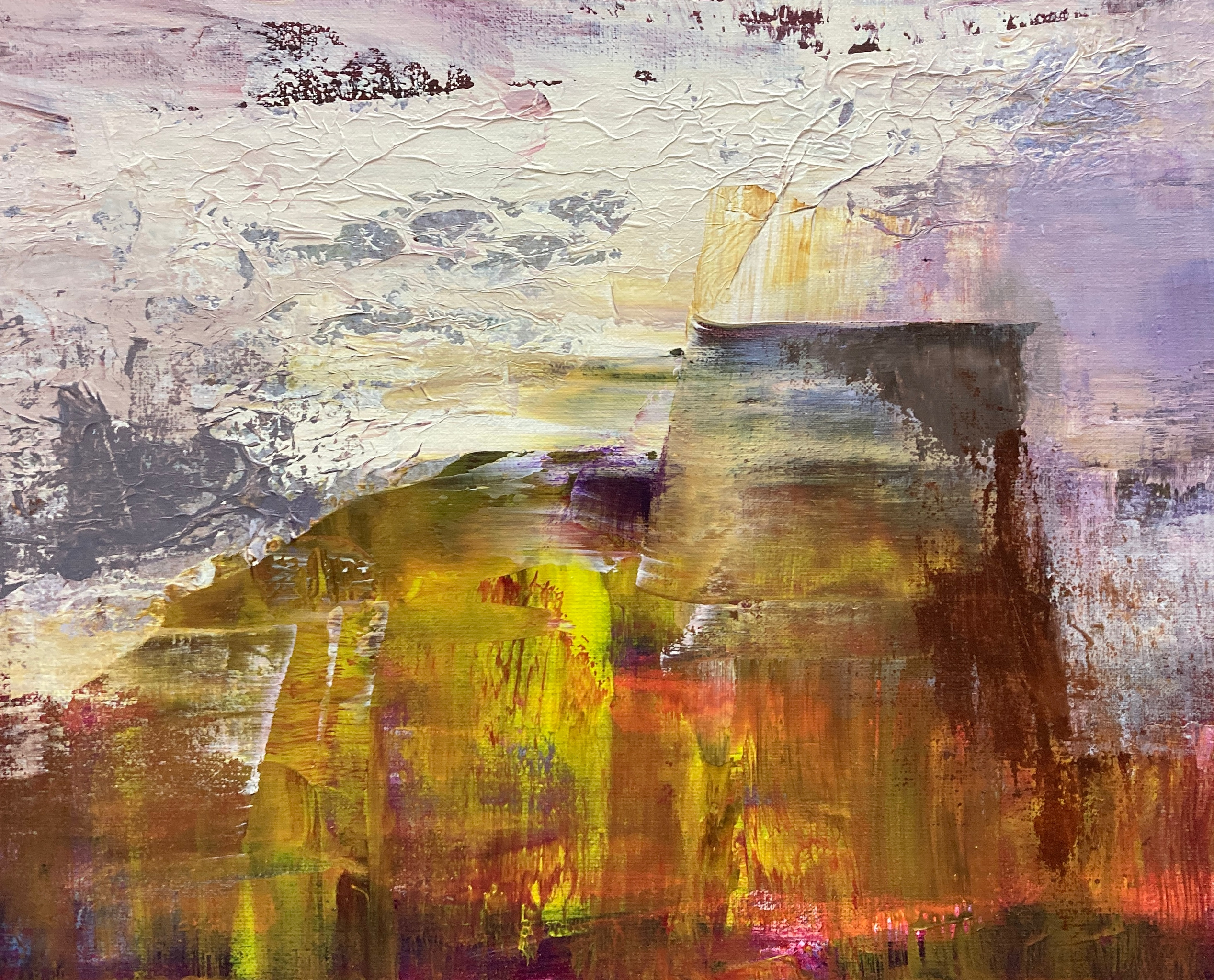 'Het landschap als vertrekpunt'. De natuur wil ik in al haar kleur, licht en donker, vormen en structuren weergeven. Mijn ontwikkeling blijft doorgaan, er is zoveel om naar te kijken en uit te drukken op het doek.