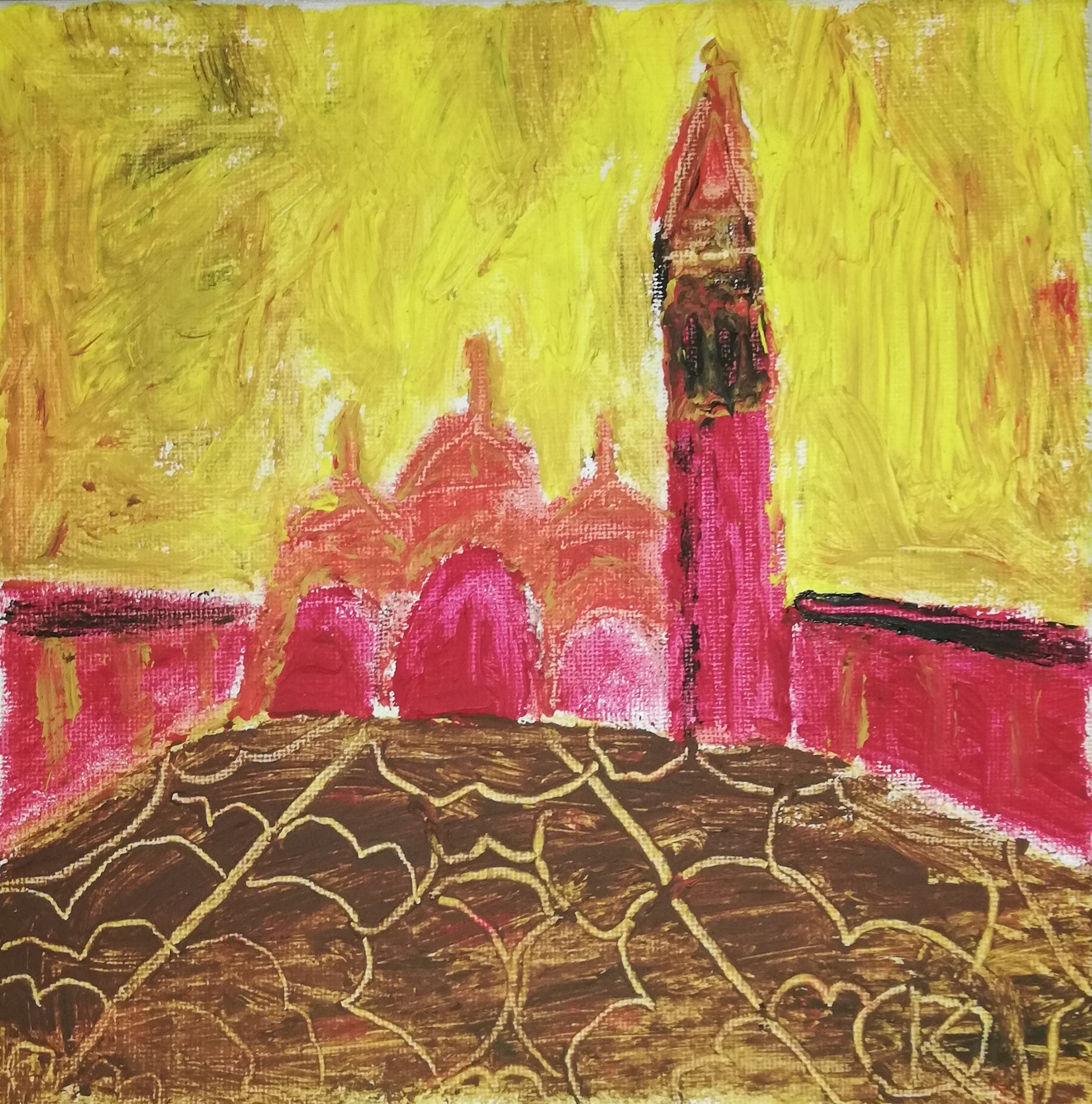 Dit kleine schilderij maakt deel uit van een serie van 2 schilderijen geïnspireerd op Venetië, waarbij dit schilderij de het San Marco plein toont. Het is uitgevoerd in rode en gele tinten, terwijl het broertje van dit schilderij Ponte di Rialto juist in blauwe en groene tinten is gemaakt. Beide werken combineren olieverf en acrylverf, wat zorgt voor een interessant contrast tussen grove en gladde vlakken. Daarnaast zijn er lijnen gekerfd met de achterkant van een penseel, wat extra textuur en diepte geeft. Deze schilderijen zijn belangrijke studies waarin ik experimenteerde met nieuwe technieken.