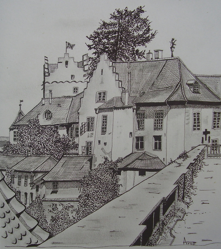 Tekening van kasteel in Meersburg Zuid-Duitsland Bodensee. Potlood, inkt. A4 formaat