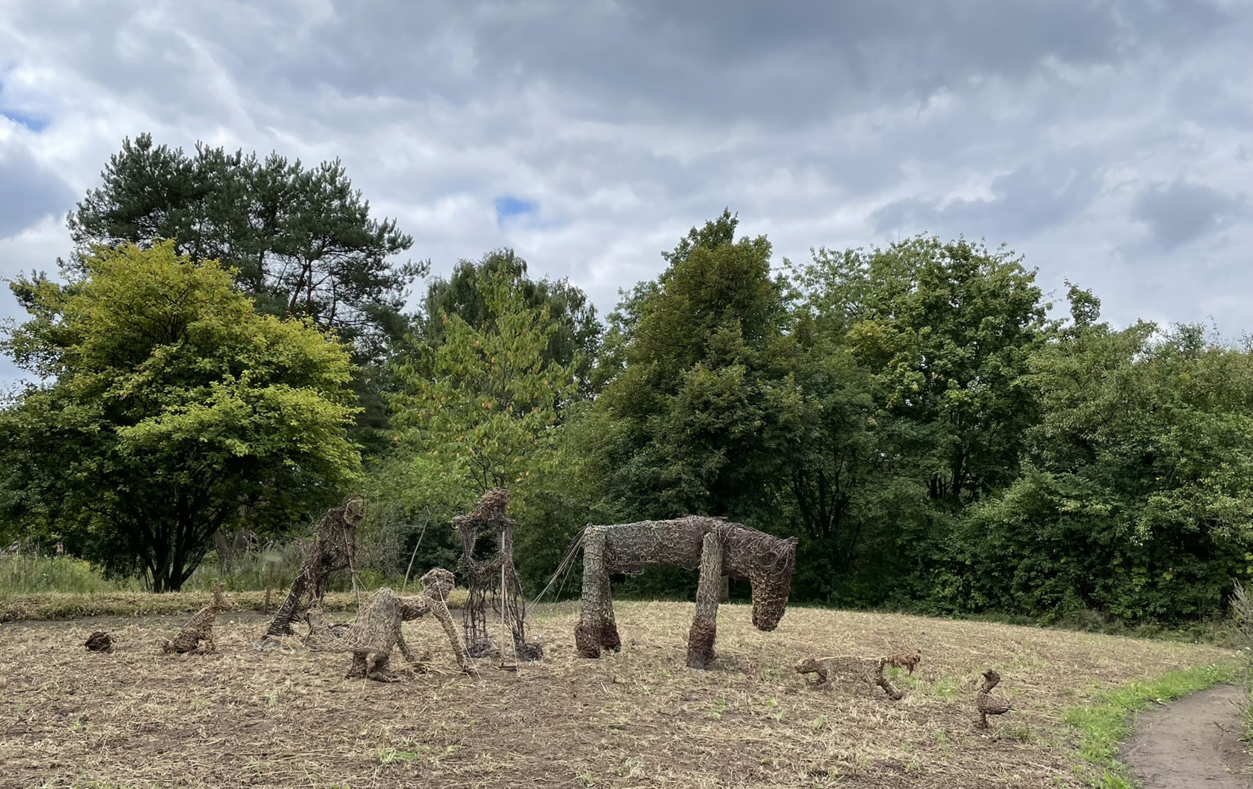 Bij het bezoek aan de Heemtuin in Rucphen ter voorbereiding van Heerlijke Kunst hoorde ik van de oogstdag , waarbij het graan op de korenakker met de hand wordt gezeisd en tot schoven gebonden. In 2025 mogelijk niet omdat de oogst mislukt is, maar dit ambachtelijke werk van vroeger tijden verbind ik met mijn jeugd. Ik besloot om dit tot onderwerp van mijn werk te maken. De beelden staan op het korenveld. Materiaal gevlochten gras en berkenhout