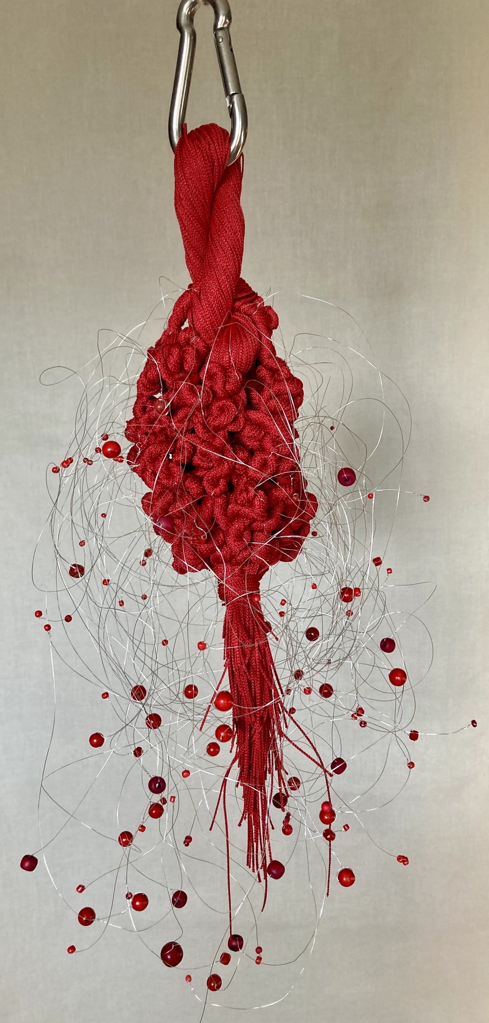 "Verdraaid ingewikkeld" Dit werk is begonnen als weer een nieuw experiment, terwijl ik bezig was voelde het af en toe als een gevecht met het touw. Een nieuw materiaal en een nieuwe techniek die ik moest temmen. Soms kwam ik handen te kort en was iedere stap een nieuwe uitdaging en voelde het Verdraaid ingewikkeld! Vrij hangend in de ruimte komt zij het meest tot haar recht!