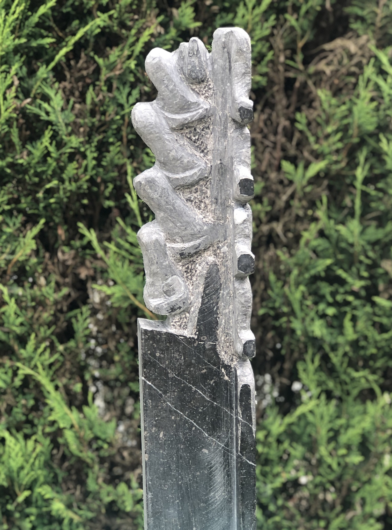 Aconitum = Monnikskap = Natuur in kwadraat en duurzaam! Een haardsteen uit het huis van een vriendin was de uitdaging. Ze heeft een bedrijf met de naam Aconitum dwz. De wetenschappelijke naam voor monnikskap. En de steen was lang en smal. Dus werd de gele monnikskap uitgangspunt voor mijn kunstwerk. Een plant in natuursteen is natuur in kwadraat – en een duurzaam buitenbeeld. Ook nog eens bio kunst – de natuur mag er haar gang mee gaan.