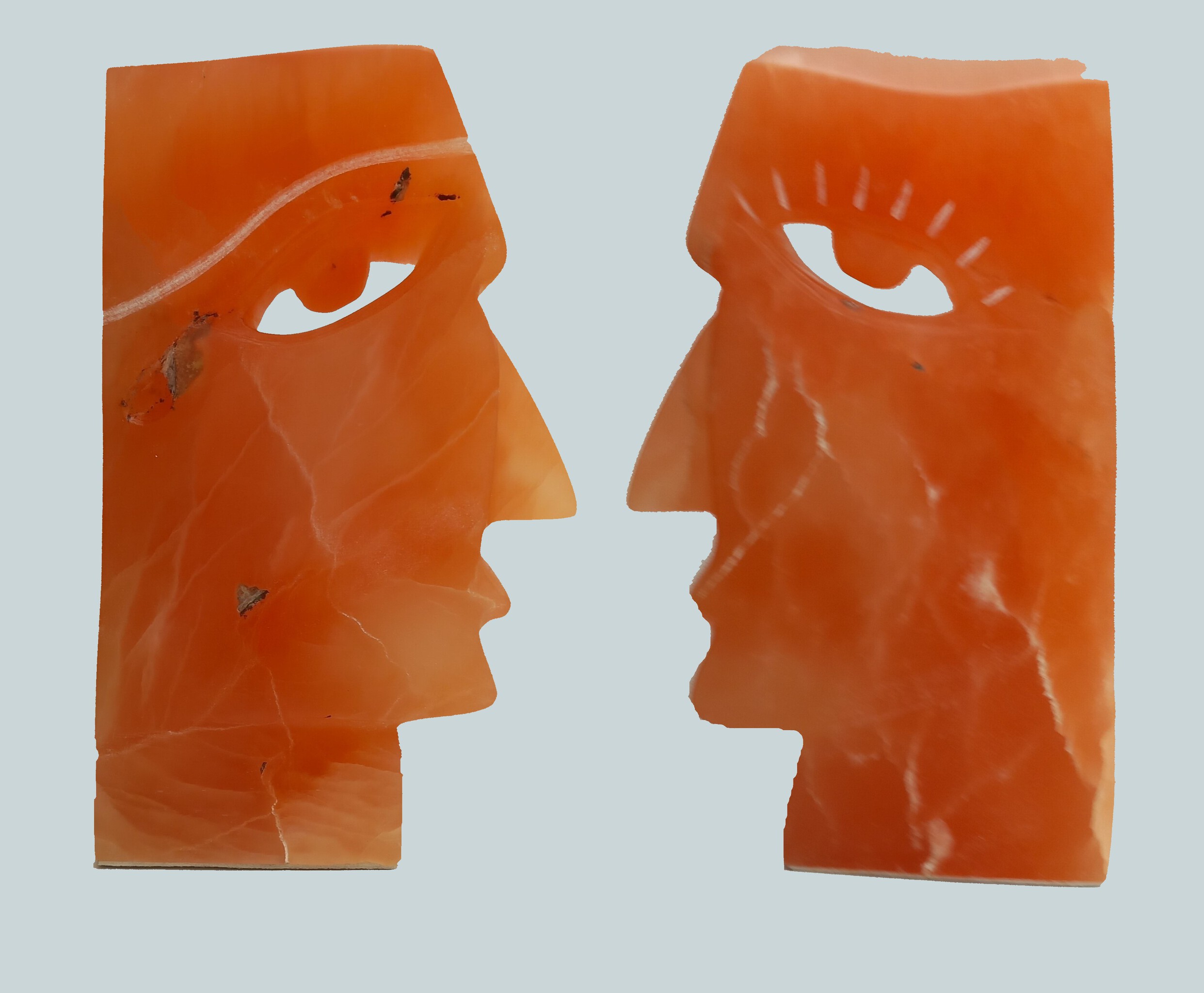 Ik vind de oranje seleniet erg mooi en heb al verschillende beelden daarvan gemaakt. Zo ook deze kop met opengewerkt oog. Beide zijden zijn verschillend.