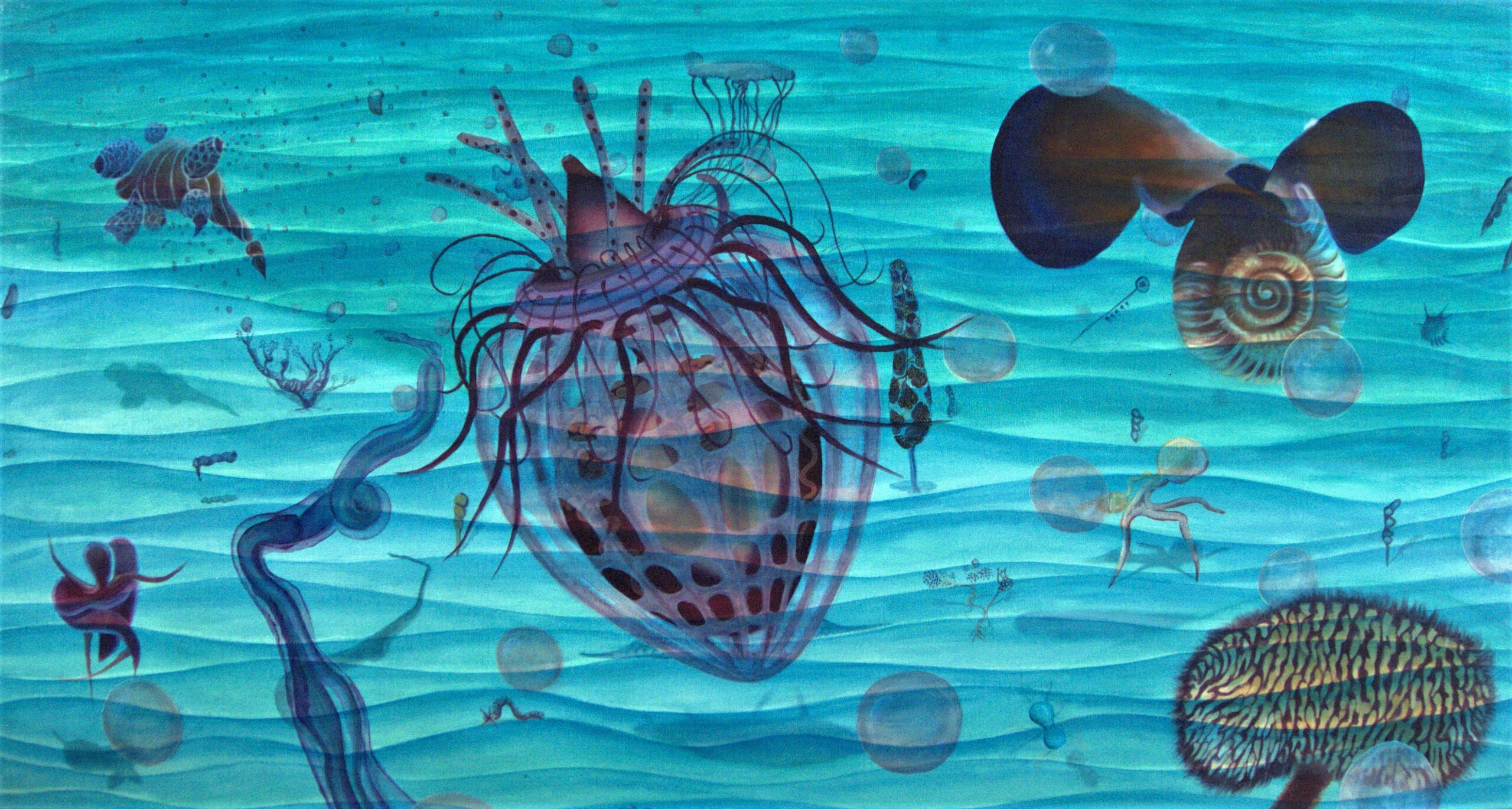 Het zelfportret werd langzaamaan abstracter; de hoofdvorm is nog wel te herkennen. In mijn hoofd zie je letterlijk wat mij inspireert. De actuele ontdekkingen van nieuwe dieren in de diepzee maakte dat ik een paar prachtige boeken kocht, waaronder Art Forms in Nature van Ernst Heackel. Eindeloos maakte ik tekeningen en schilderijen naar aanleiding van zijn prachtige illustraties.
