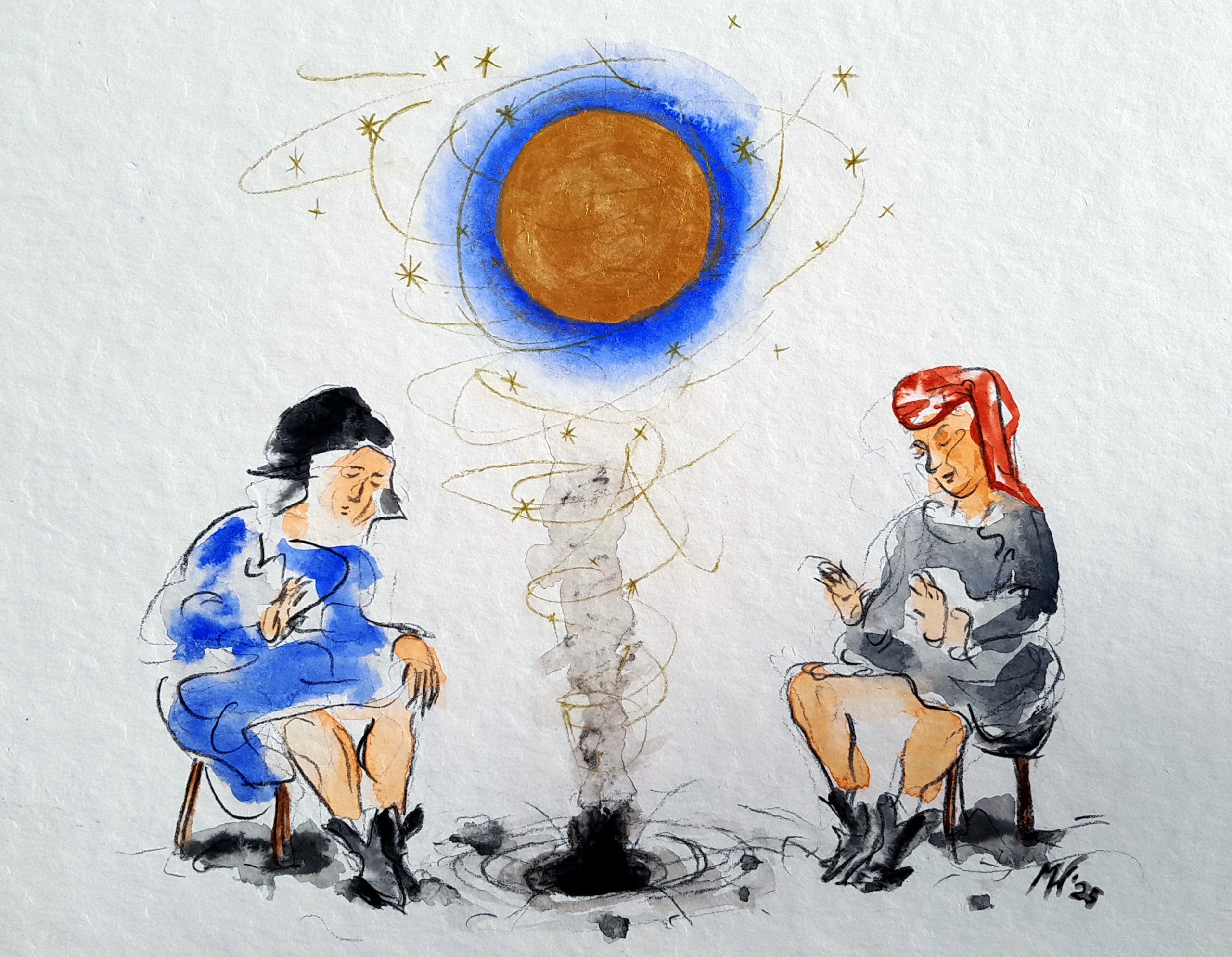 Wat openbaart zich vanuit de aarde aan de voeten van deze twee figuren? Geïnspireerd op het maandblad Februari uit de Très Riches Heures van de Gebroeders van Lymborch. Kleurpotlood, aquarelverf en water op 300 grams aquarelpapier.