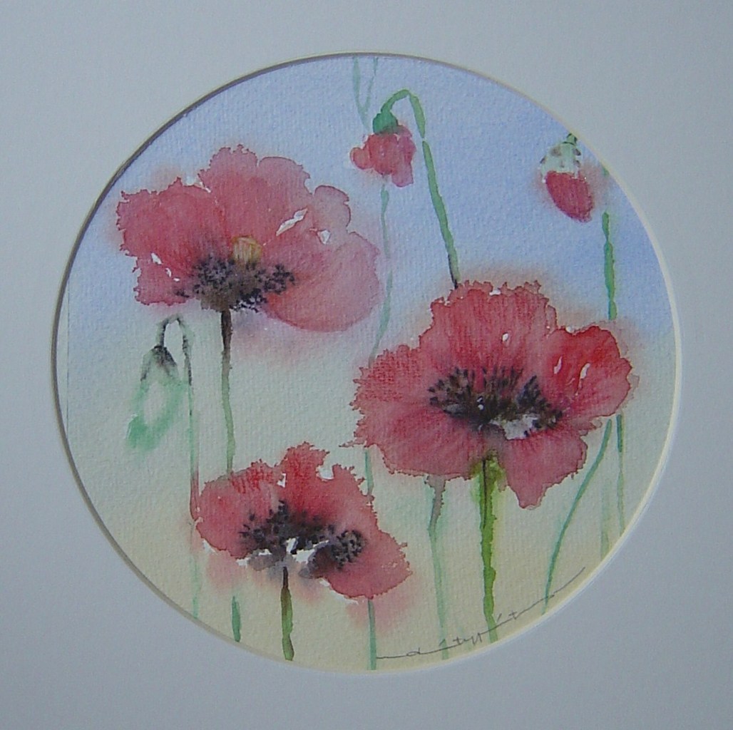 Kleine aquarel in rond passepartout.