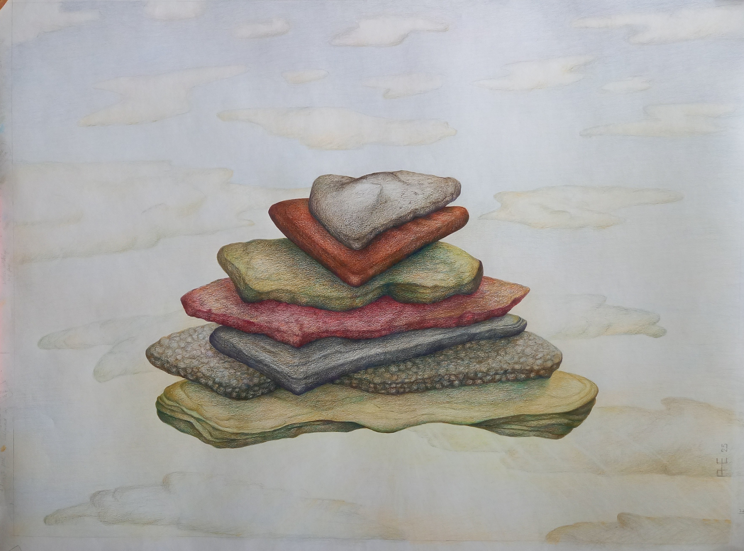 Spiritueel Wolken Tekening Magisch Lucht Realisme Zweven Ruimte Kleurpotlood Meteorieten Steenstapel Stenenman Stenen