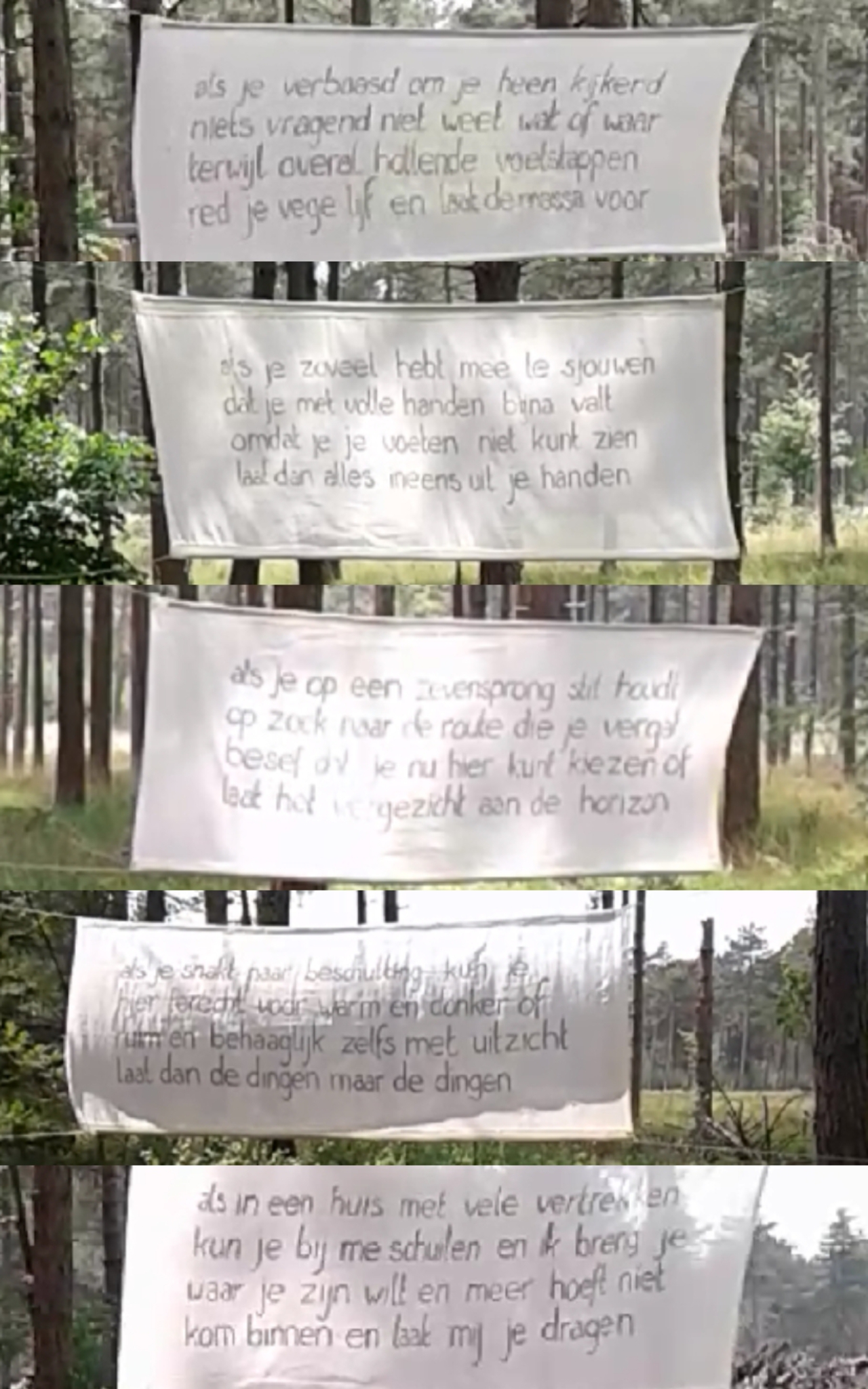 Natuur biedt meer dan al het andere de mogelijkheid om alles los te laten, om te zijn. Gewoon zijn. Het gedicht Laat dan roept de lezer op alles uit de handen te laten vallen, zodat troost zijn weg kan vinden. De vijf strofen zijn op afzonderlijke doeken aangebracht waarop het weer zijn sporen heeft nagelaten. Met elkaar vormen de doeken een intieme ruimte om alles van je af te laten glijden.