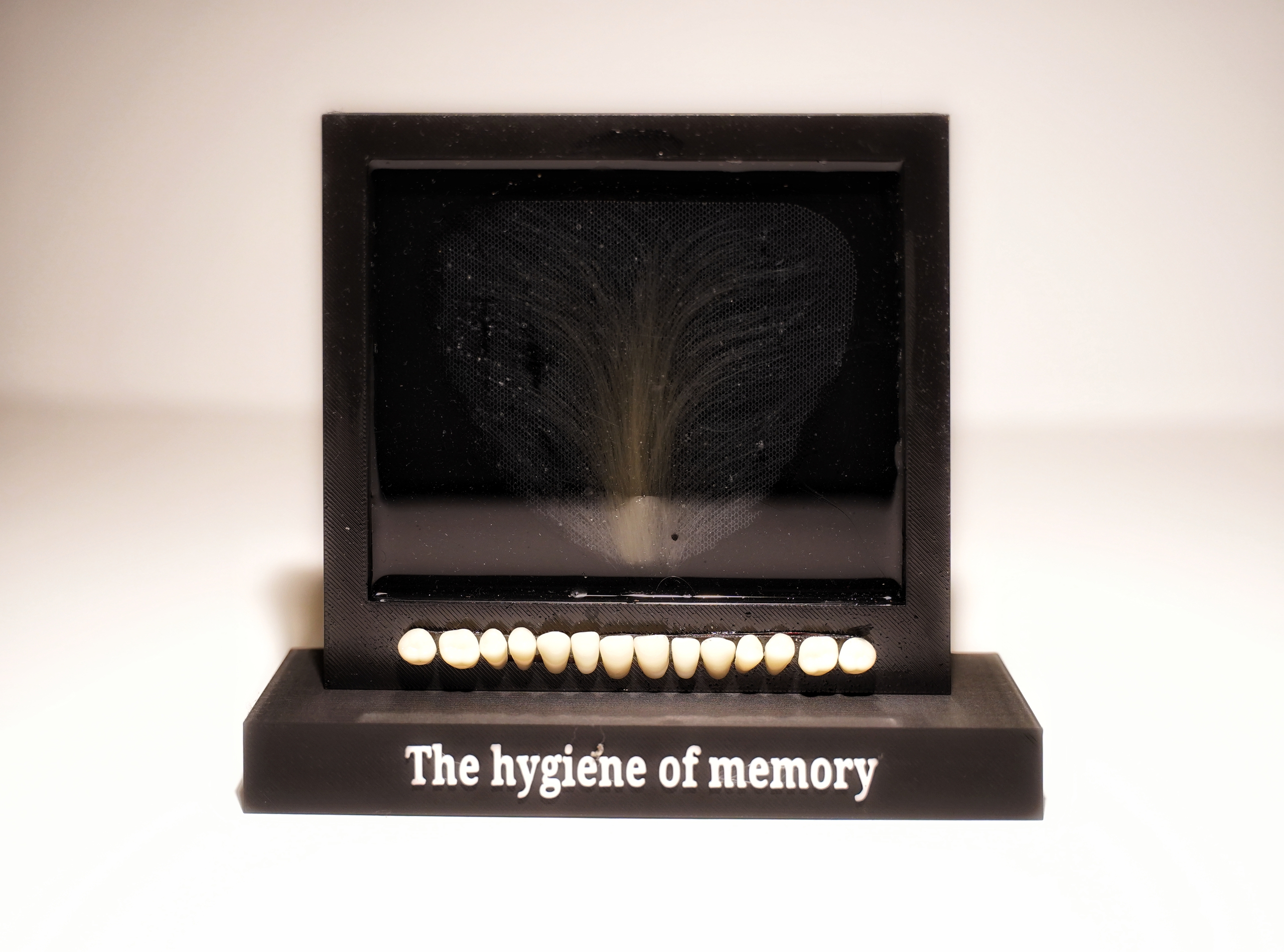 Within a rigid 3D printed, black frame filled with resin, a tuft of artificial pubic hair is preserved. Along the lower edge, a straight line of artificial teeth is aligned, cold and repetitive. These elements evoke intimacy, the body, and memory, yet their artificiality undermines their authenticity. The work reflects on how memory is “hygienized”: emotion and corporeality are reduced to objects, preserved as specimens in a clinical archive. A tension emerges between intimacy and distance, relic and reproduction, life and simulation.