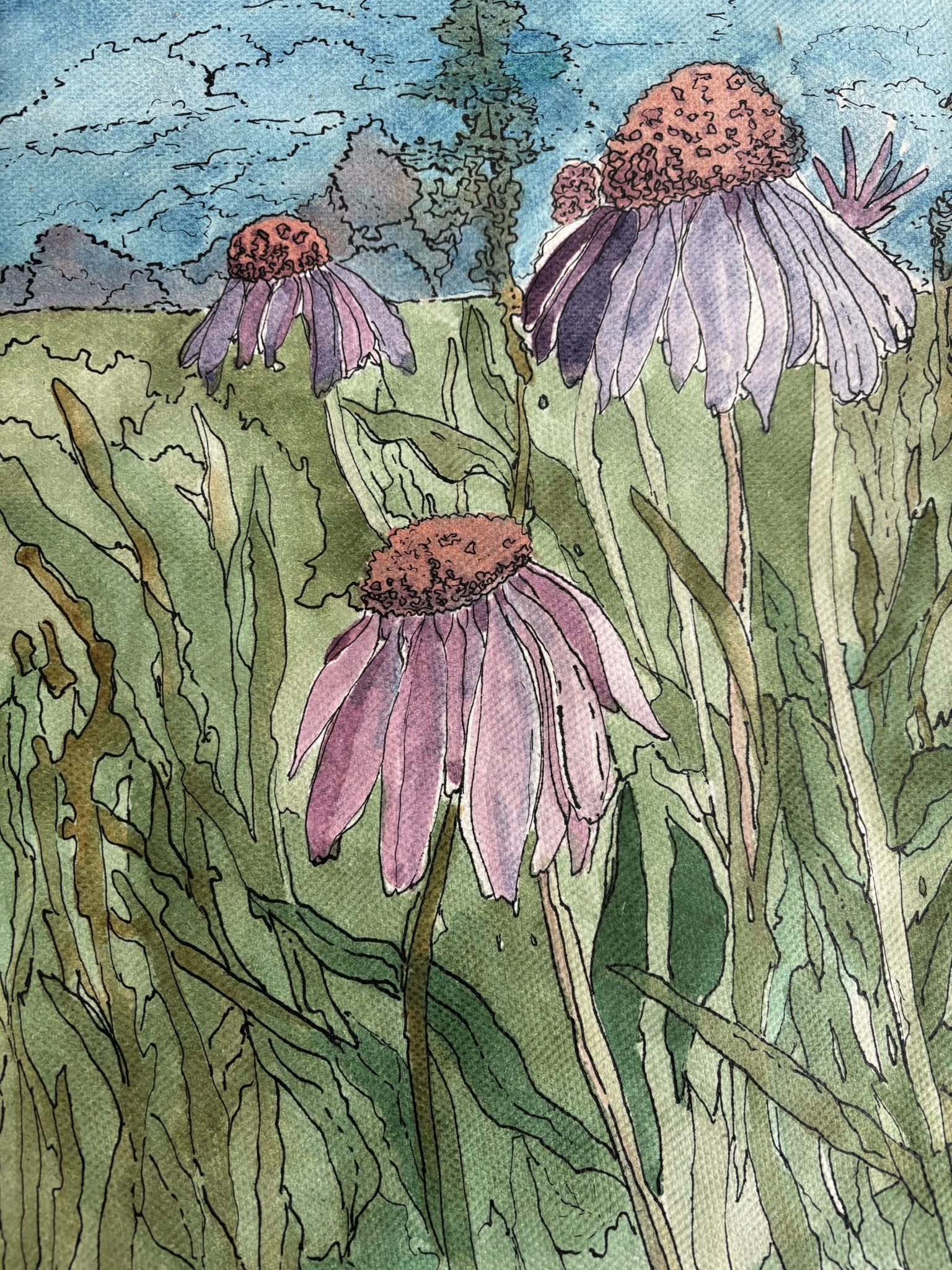landschap met bloemen op ZaansBord in aquarel opgezet en met OI inkt omrand