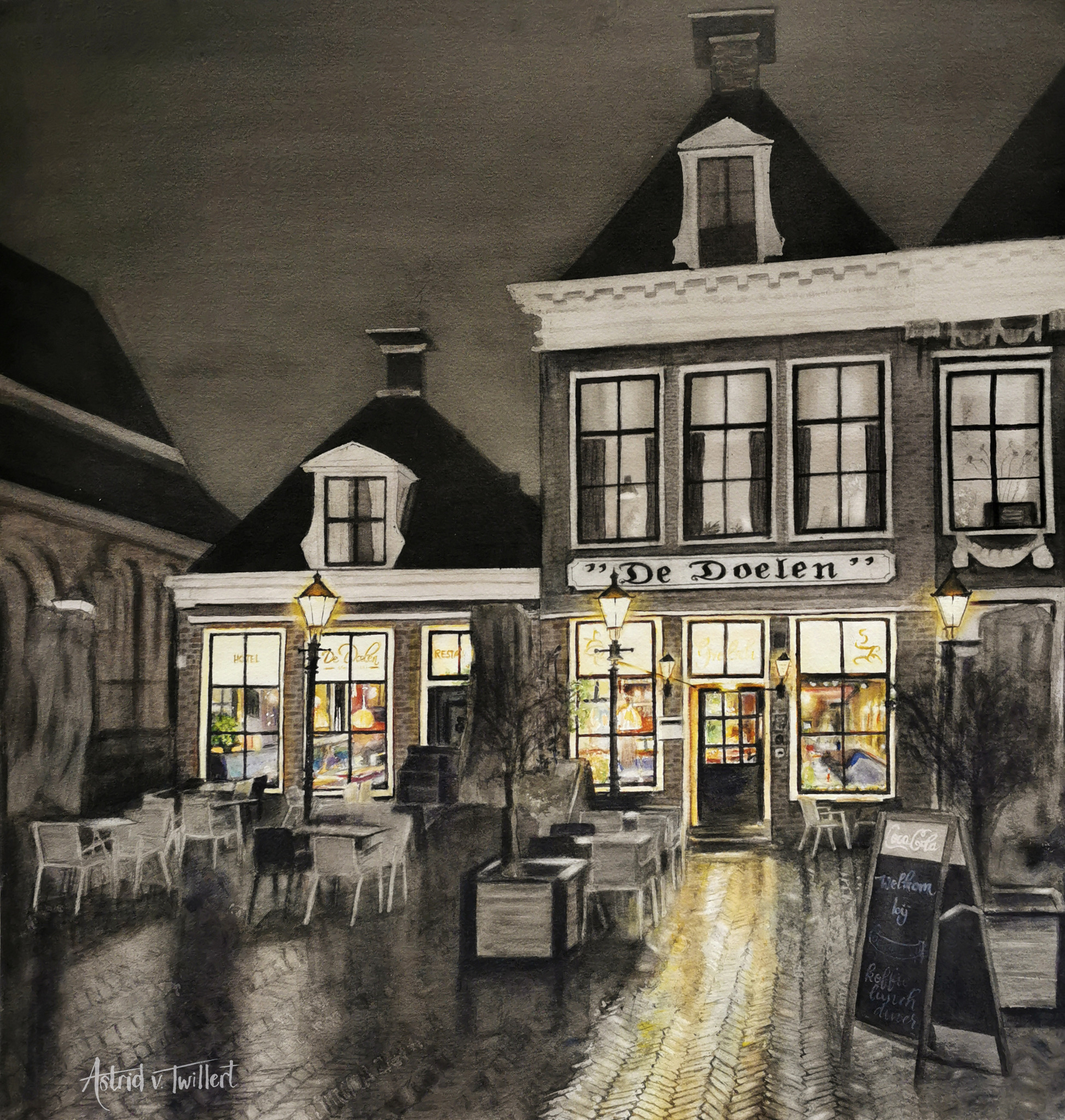 ☼ ‘Honourable Mention’ bij de gejureerde tentoonstelling ‘Nocturno’ van IWS Titicca Punu Peru (2022). | Dit werk verbeeldt het moment in december 2021 dat opnieuw de coronalockdown inging. De gasten hadden Grand café De Doelen in Franeker net verlaten. Het werd buiten donker, maar binnenin bleef het licht symbolisch branden. Het origineel is te koop. Giclées zijn te koop in een speciale gelimiteerde oplage van 10 stuks