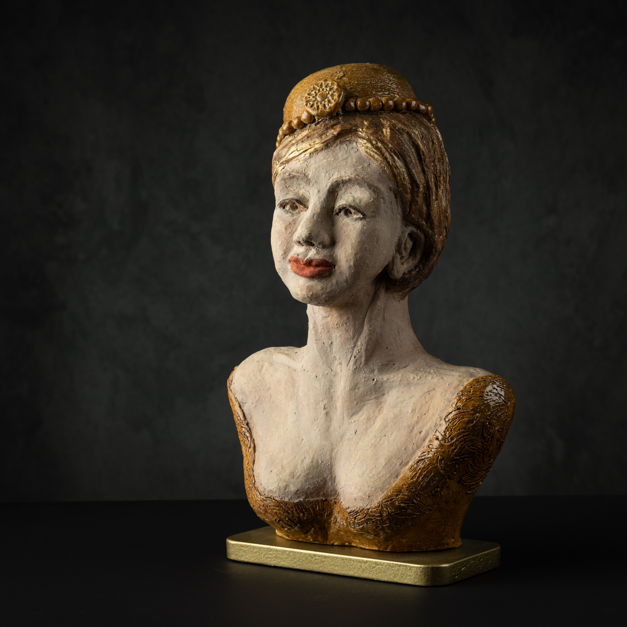 Sophie is gemaakt van Aardewerk klei. Afgewerkt met glazuur en onderglazuur. Het beeld is gebakken op 1150 graden.