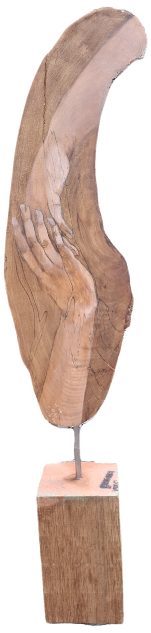 De handen om van te houden. Ik vond dit afgezaagd stuk hout op de Hoge venen evenals wat andere stukken. Hier is een heel oude boom vergaan , dacht ik. Mogelijk nog een oerbos. Het maakt dit werk extra waardevol om een evolutie in het thema Love yourself te zien. Hoogte incl. houten sokkel en pin is, 69 cm