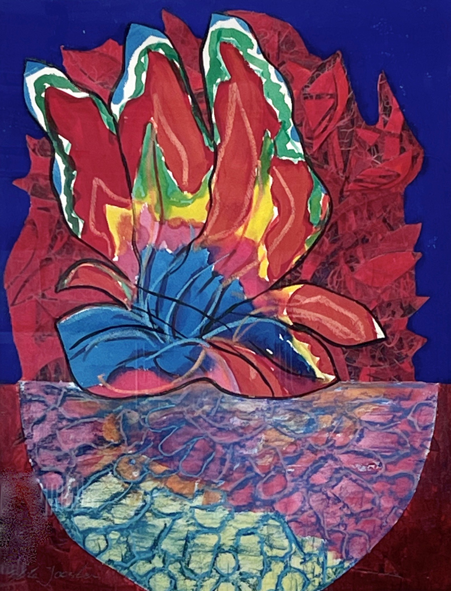 In dit werk heb ik pastel, gouache en Oost-Indische inkt gebruikt om expressionisme, impressionisme en semi-abstractie te versmelten tot een levendige energiestroom. Hier verken ik het dynamische samenspel van kleuren en texturen, waarbij ik de gepassioneerde essentie van de vergankelijke schoonheid van de natuur oproep. Het werk is voorzien van een passepartout en aluminium lijst.