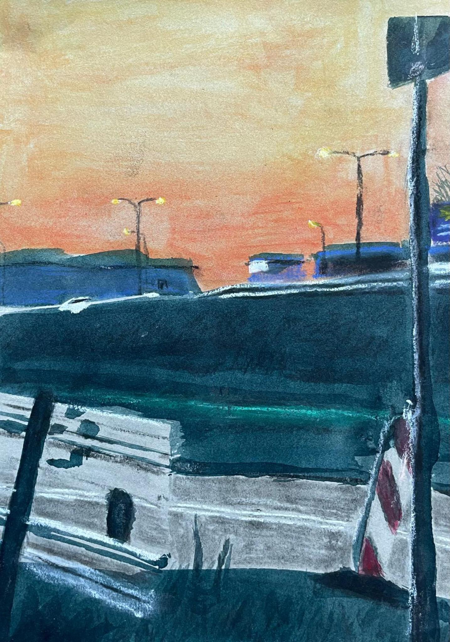 Wegwerkzaamheden bij zonsondergang Deze krijttekening toont een klein stuk weg dat parallel loopt aan de provinciale weg bij Alkmaar. Langs de weg liggen voorwerpen die horen bij wegwerkzaamheden en staat een opvallend verkeersbord. Het lagere perspectief van de toeschouwer benadrukt het hoogteverschil tussen de rustige weg op de voorgrond en de drukke provinciale weg op de achtergrond. De zachte gloed van de ondergaande zon geeft het landschap een warme sfeer, terwijl de krijttekening de textuur en de contouren van het terrein en de objecten subtiel benadrukt.