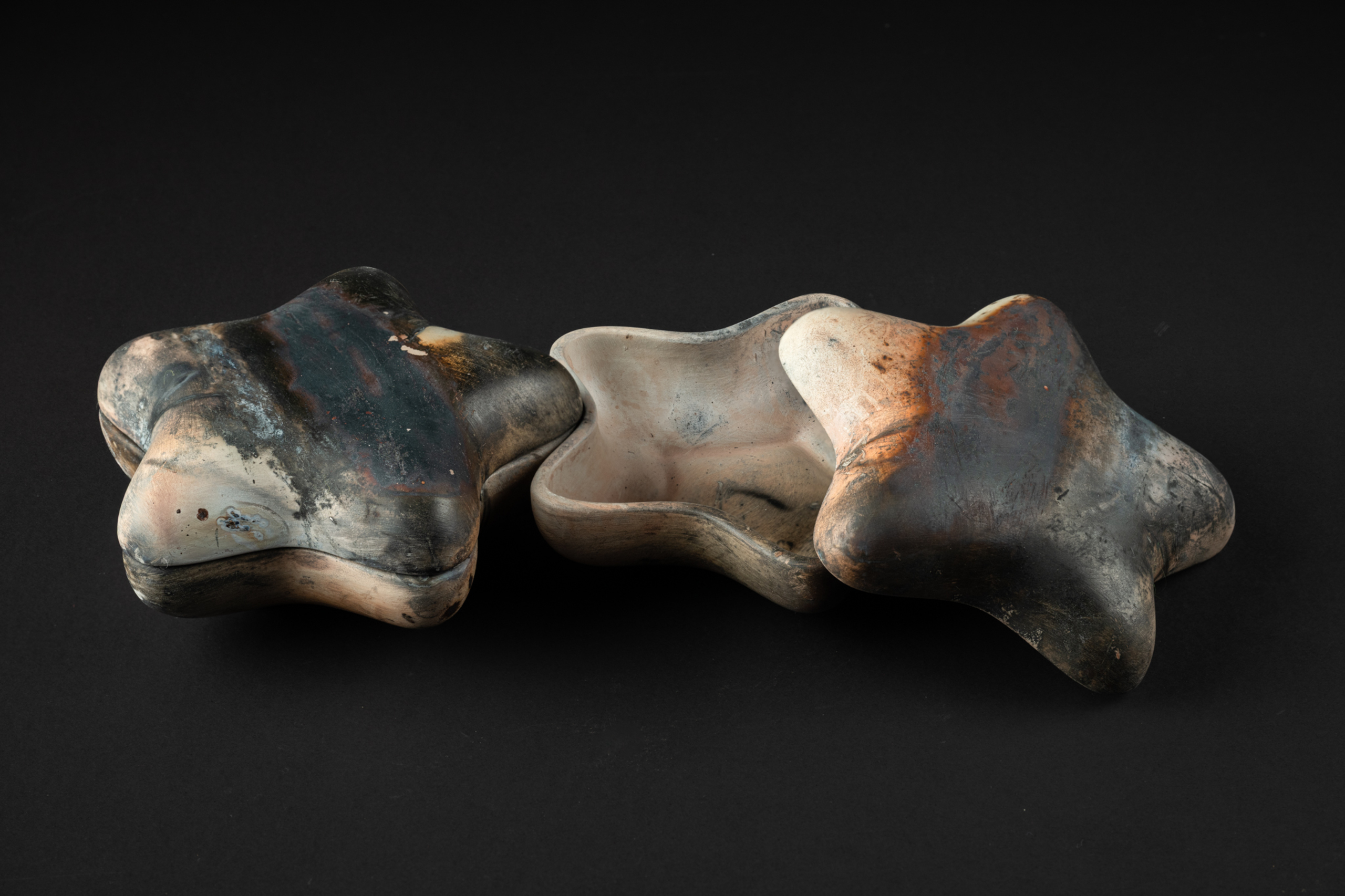 Deze doosjes zijn gegoten met giet klei. Daarna ingepakt met oxides en gestookt in de saggar pot. Kunnen ook gebruikt worden als urntjes.