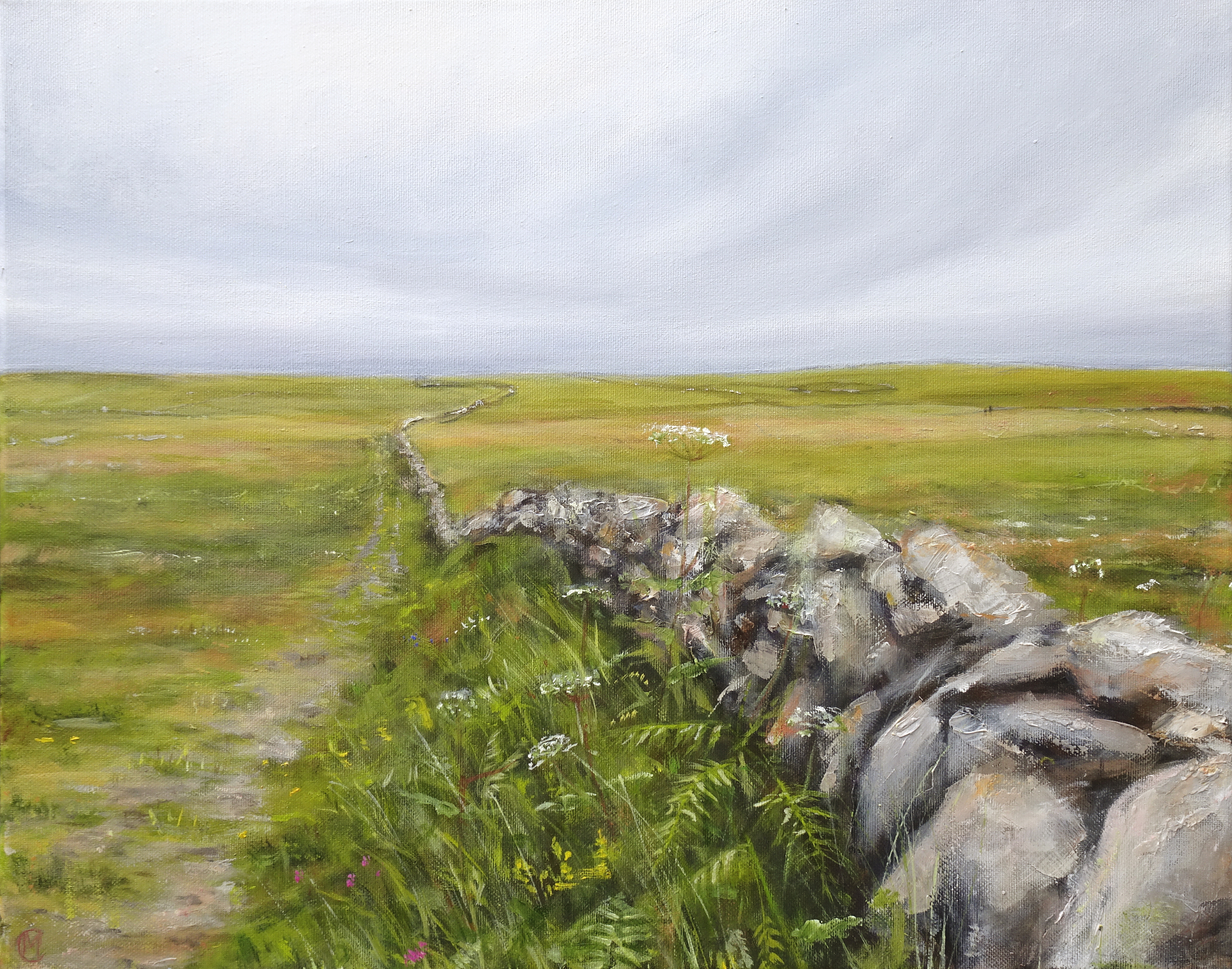 De weidsheid van het wad, wind en water tot aan de horizon. Het is deze weidsheid die ik in mijn landschappen wil laten zien. In dunne lagen olieverf geef ik de tere kleuren tussen land en water weer.