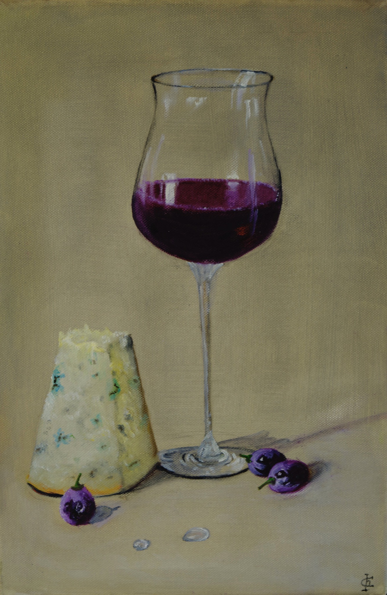 Op de eettafel werd de compositie gemaakt en daarna werd dit vrolijke werk van wijn en kaas geschilderd.