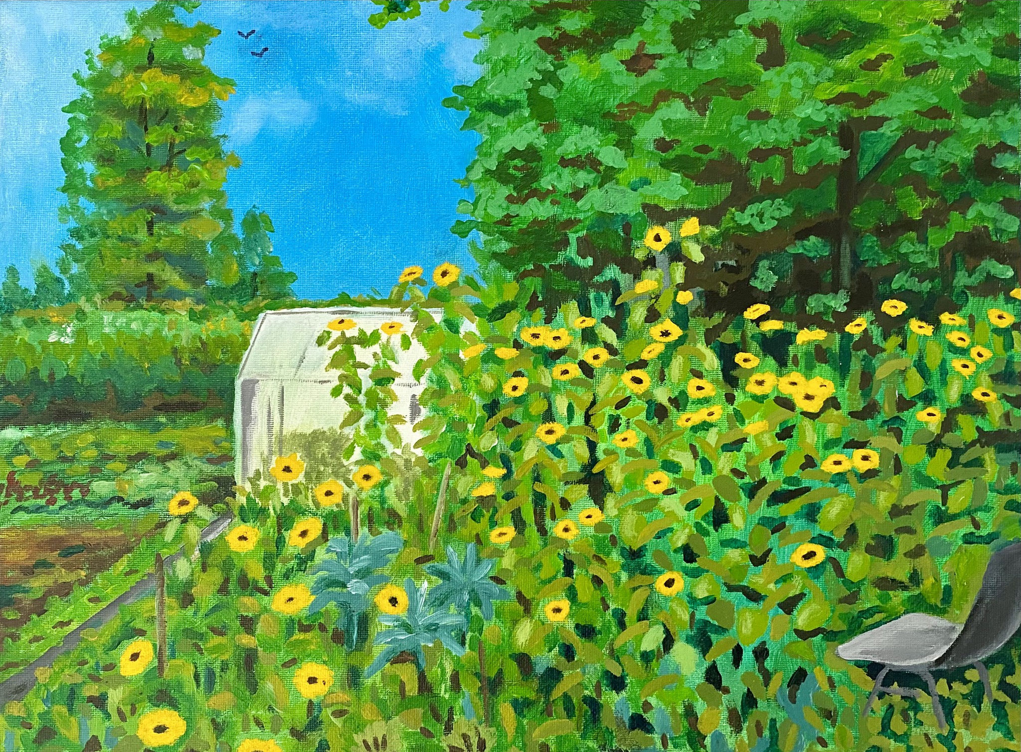moestuin met bloeiende aardpeer en zonnebloemen