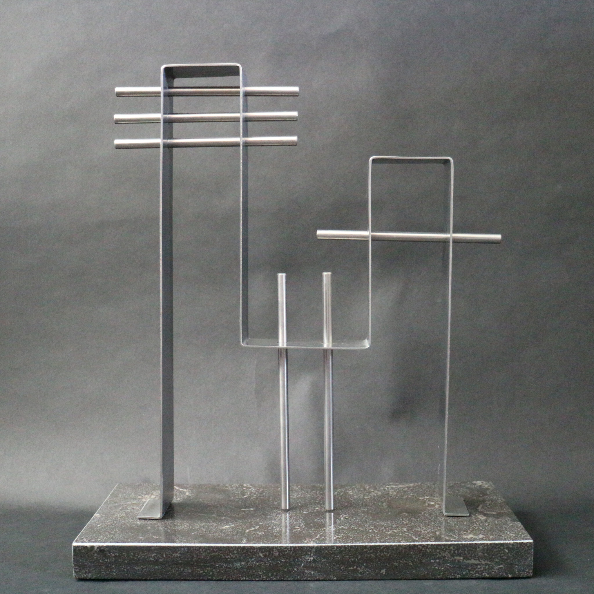 Gemaakt van 4 cm breed, 2 mm dik RVS strip. Gemonteerd op een hardstenen plaat van 15 x 35 cm. De evenwijdige en verticale staven hebben een doorsnede van 8 mm.