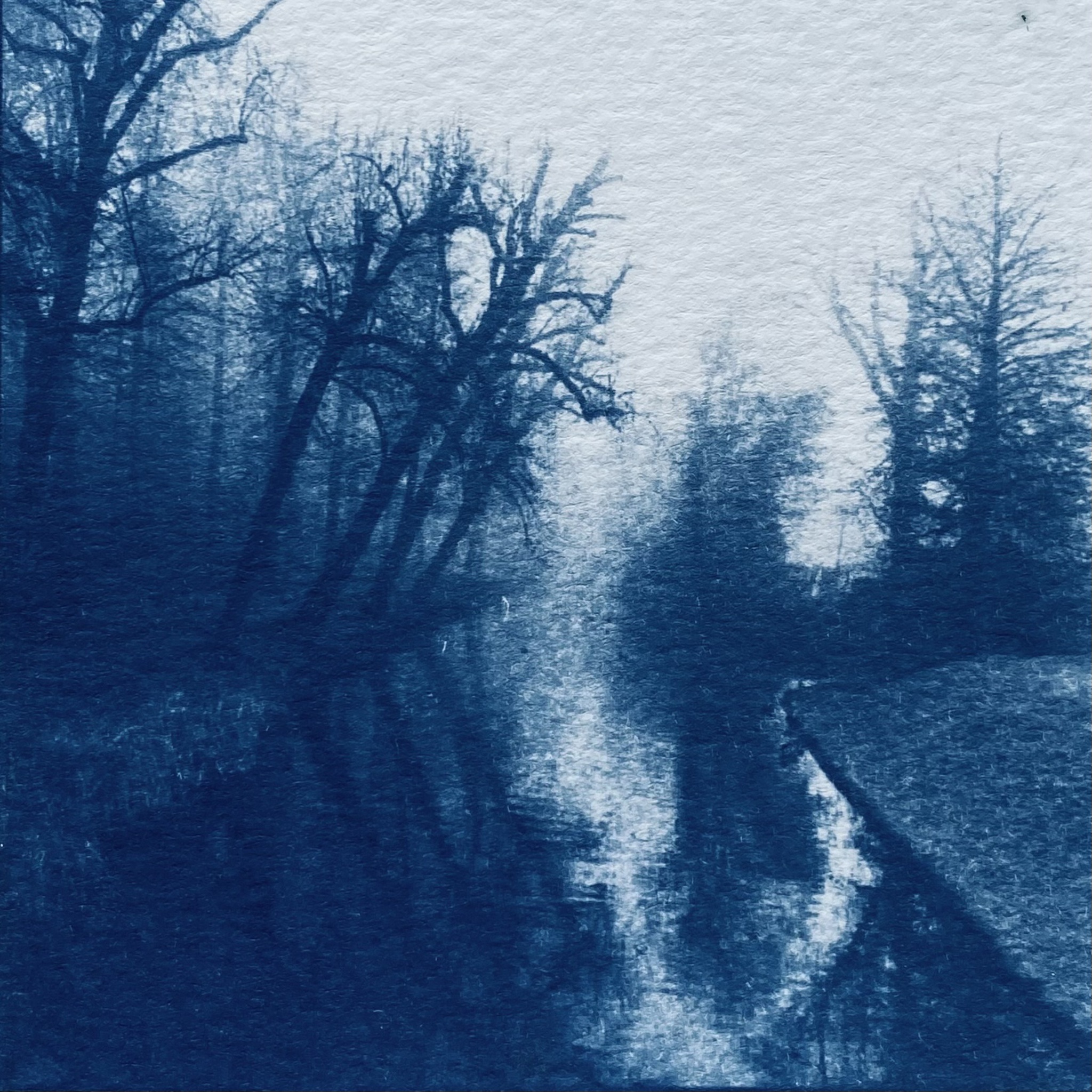 Uit de reeks Bergens Blauw, een serie unieke fotogrammen in Cyanotype techniek. De fotogrammen zijn gemaakt op 300 grams aquarelpapier en zitten in een klein houten bak lijstje. Afmeting inclusief lijst.