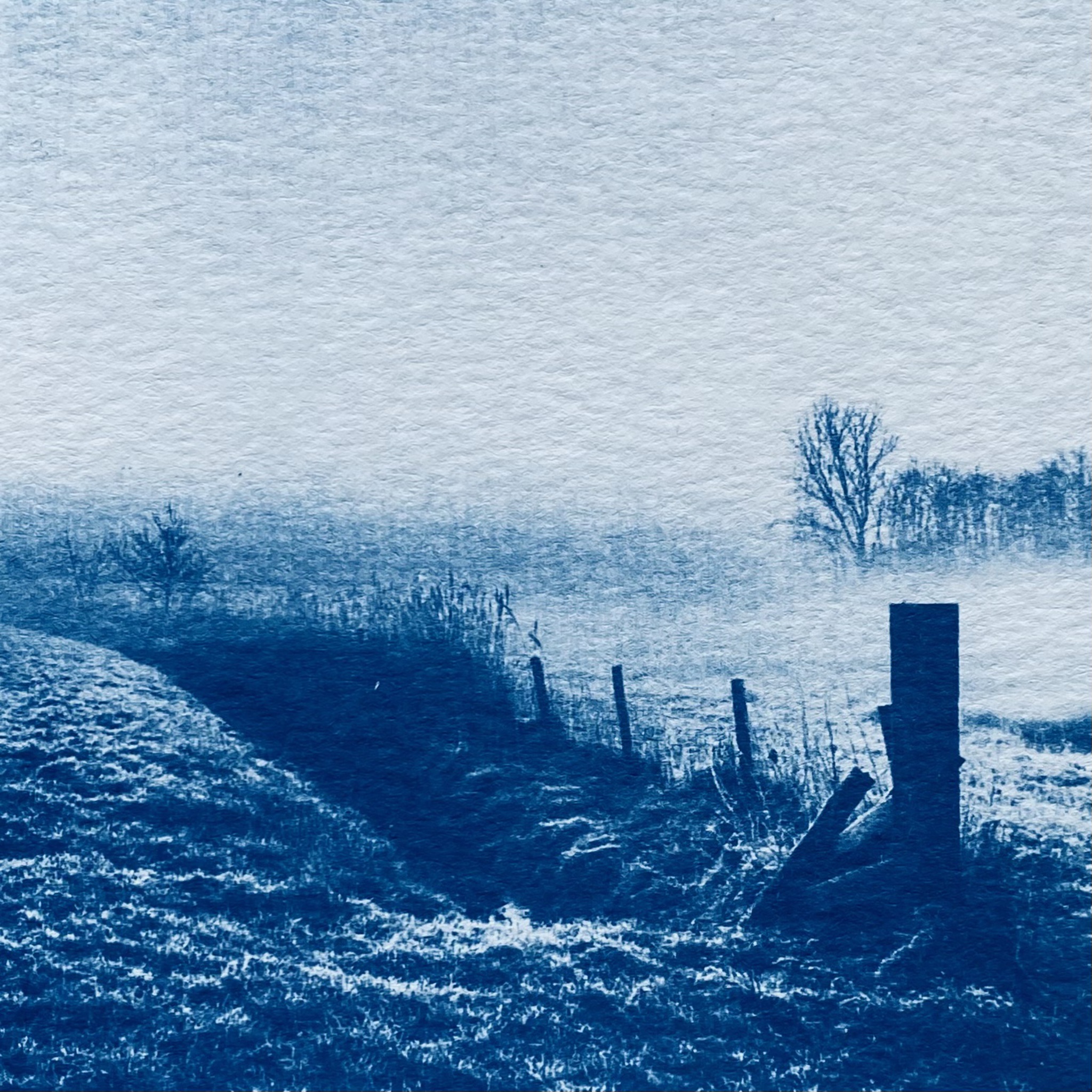 Uit de reeks Bergens Blauw, een serie unieke fotogrammen in Cyanotype techniek. De fotogrammen zijn gemaakt op 300 grams aquarelpapier en zitten in een klein houten bak lijstje. Afmeting inclusief lijst.