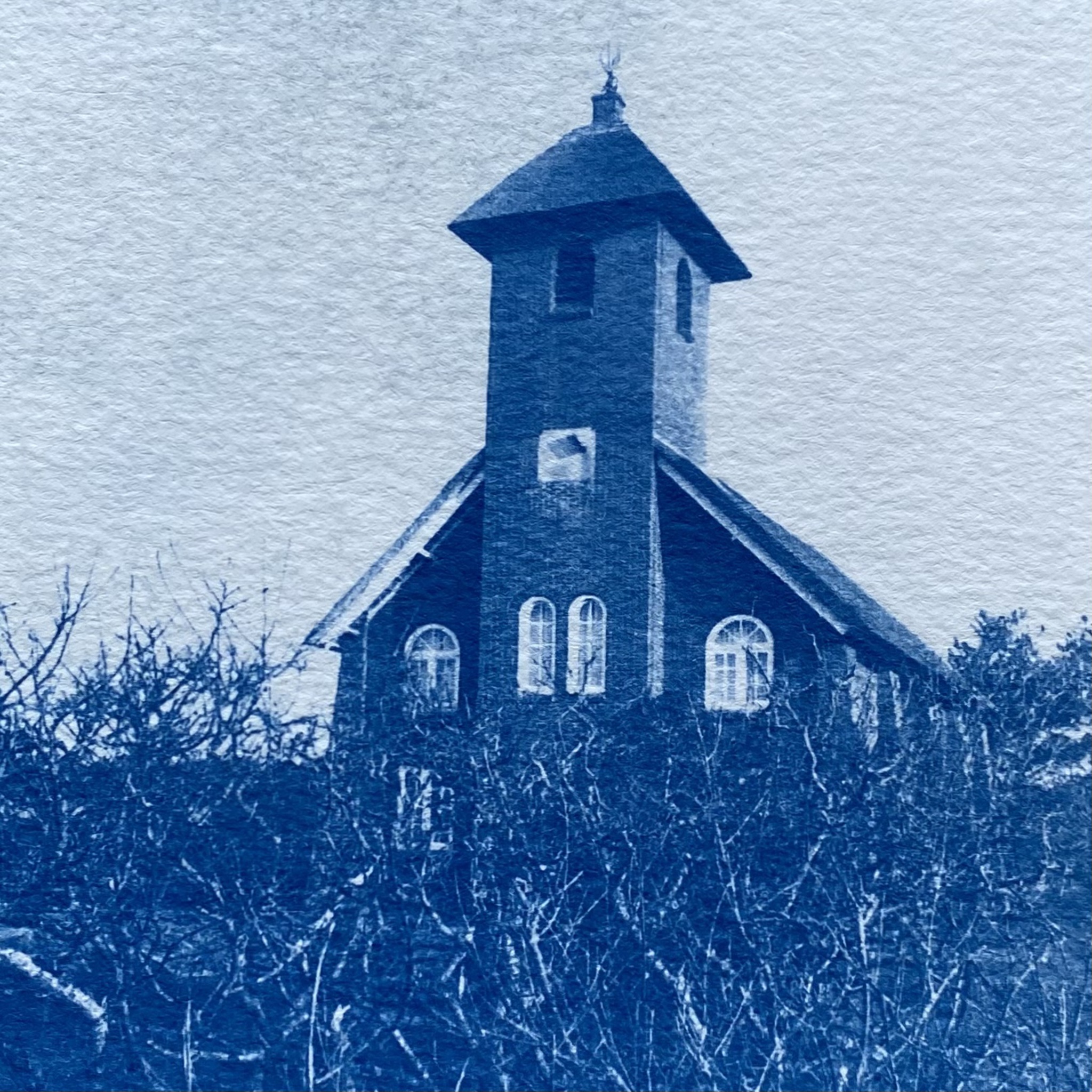 Uit de reeks Bergens Blauw, een serie unieke fotogrammen in Cyanotype techniek. De fotogrammen zijn gemaakt op 300 grams aquarelpapier en zitten in een klein houten bak lijstje. Afmeting inclusief lijst.