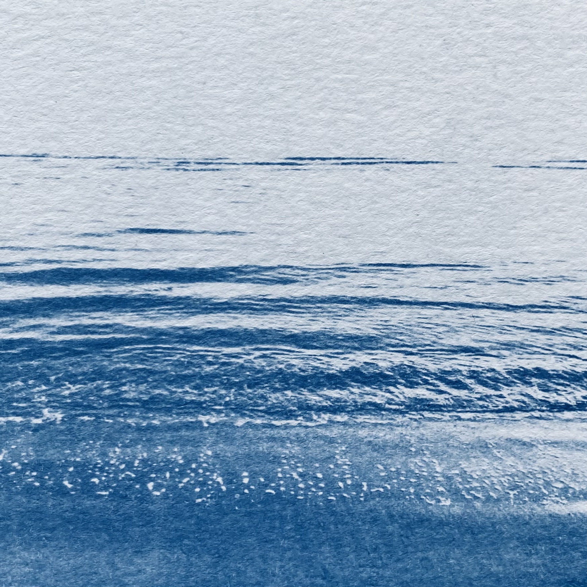 Uit de reeks Bergens Blauw, een serie unieke fotogrammen in Cyanotype techniek. De fotogrammen zijn gemaakt op 300 grams aquarelpapier en zitten in een klein houten bak lijstje. Afmeting inclusief lijst.