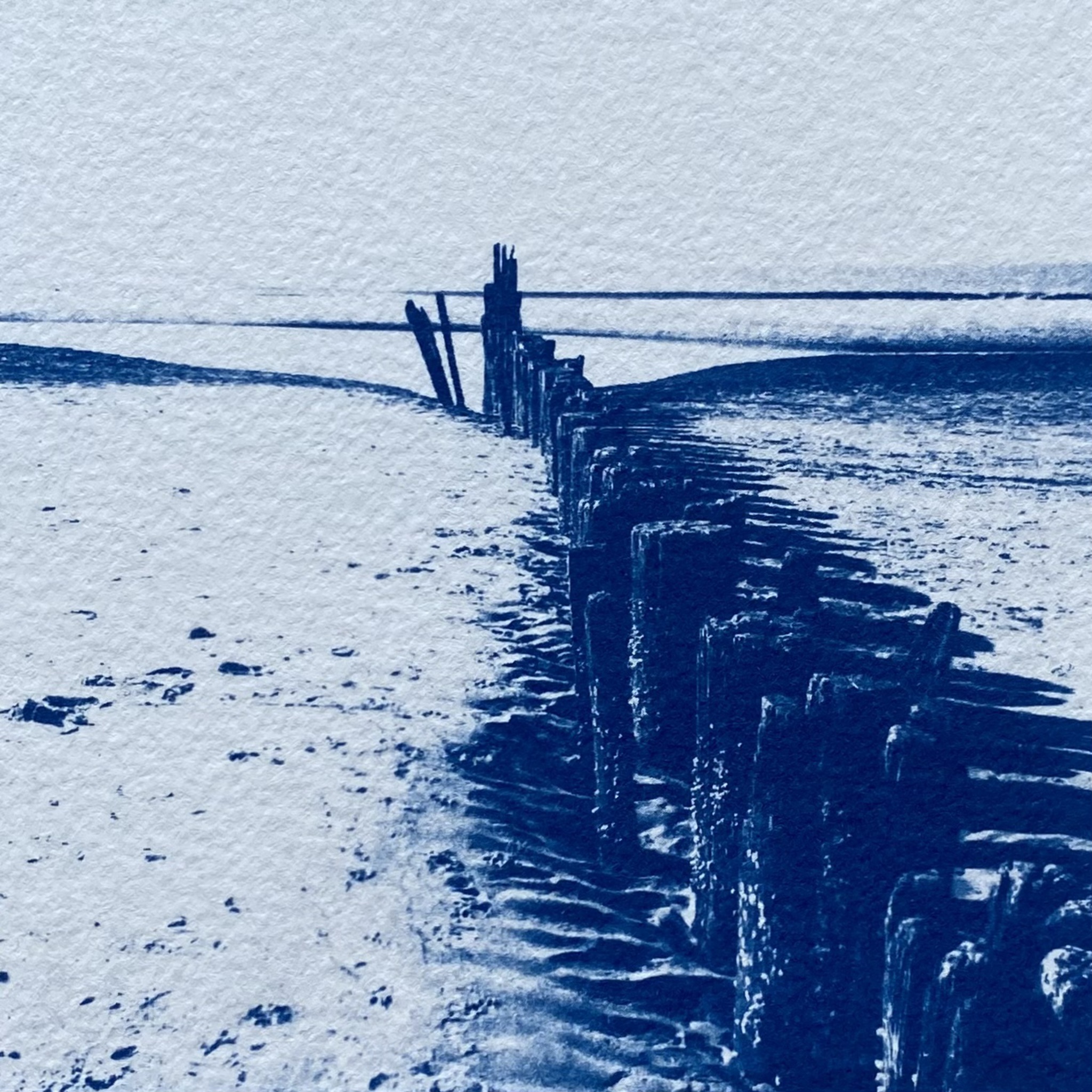 Uit de reeks Bergens Blauw, een serie unieke fotogrammen in Cyanotype techniek. De fotogrammen zijn gemaakt op 300 grams aquarelpapier en zitten in een klein houten bak lijstje. Afmeting inclusief lijst.