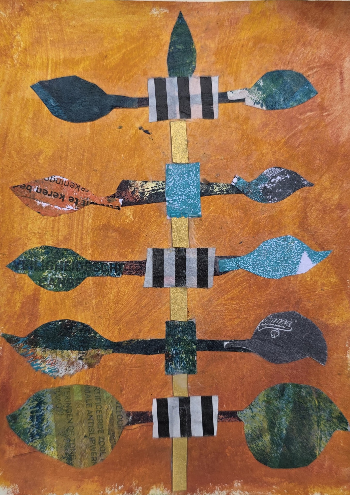 Het tonen van maar 1 foto maakt het moeilijk om boom en vaas op 1 foto te zetten. Ze horen samen, gescheiden door de ringband. Collage met hoofdzakelijk eigen gedrukt papier. De kleine collages zijn onderdeel van een veel groter geheel.