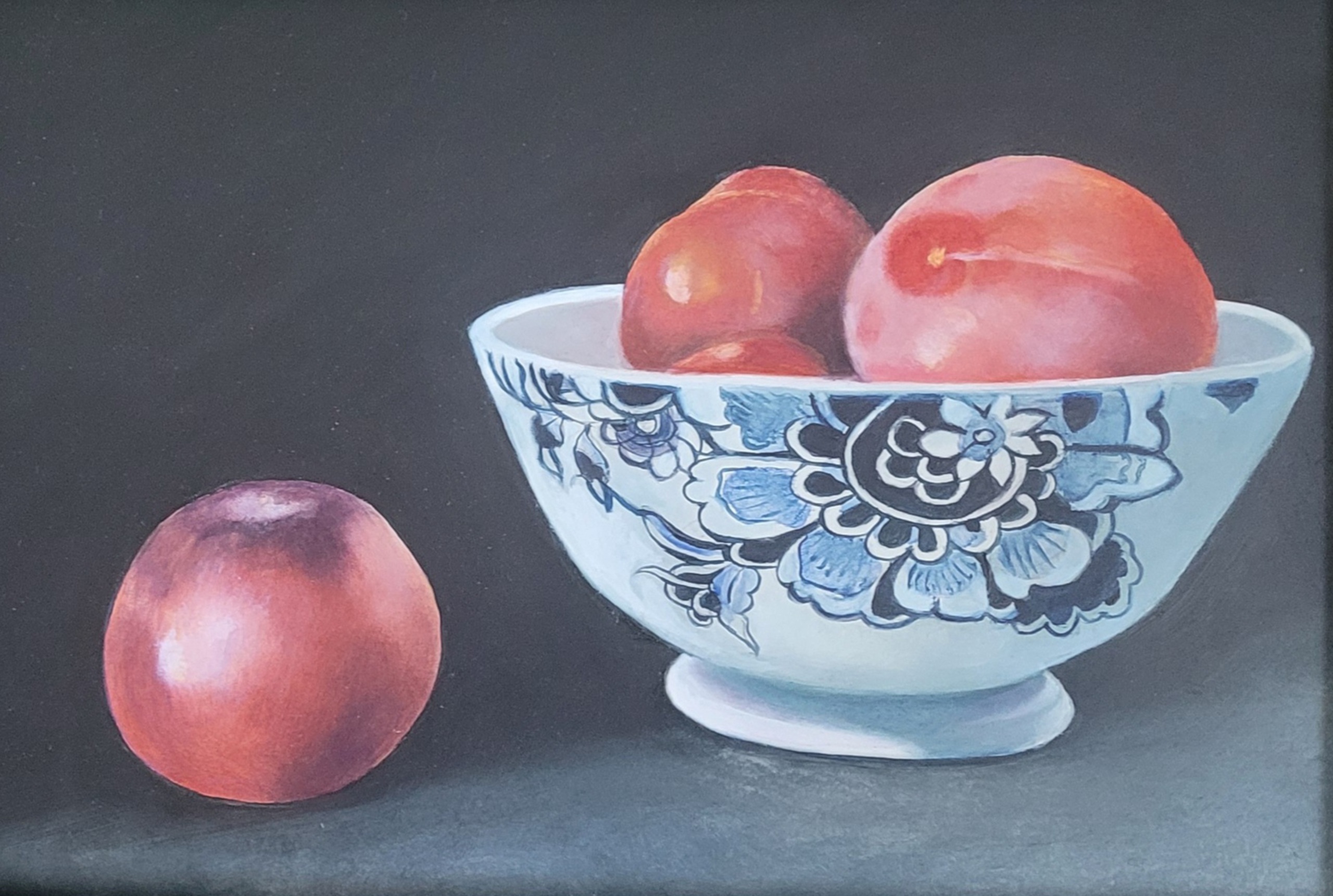 Nectarines en Delftsblauwe kom. Een studie in kontrast en harmonie.Ingelijst