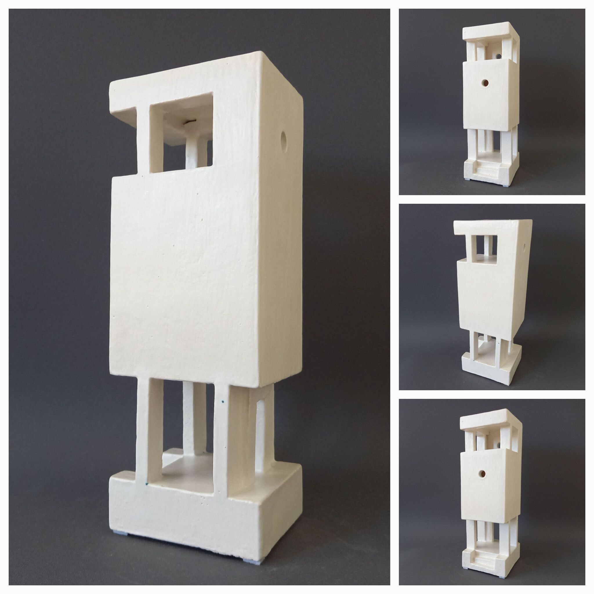 Zonnestraaltoren. Geïnspireerd op trappenhuis van voormalig sanatorium Zonnestraal in Hilversum (architecten Duiker, Bijvoet en Wiebenga, 1928). Witte klei met een mat-wit glazuur.