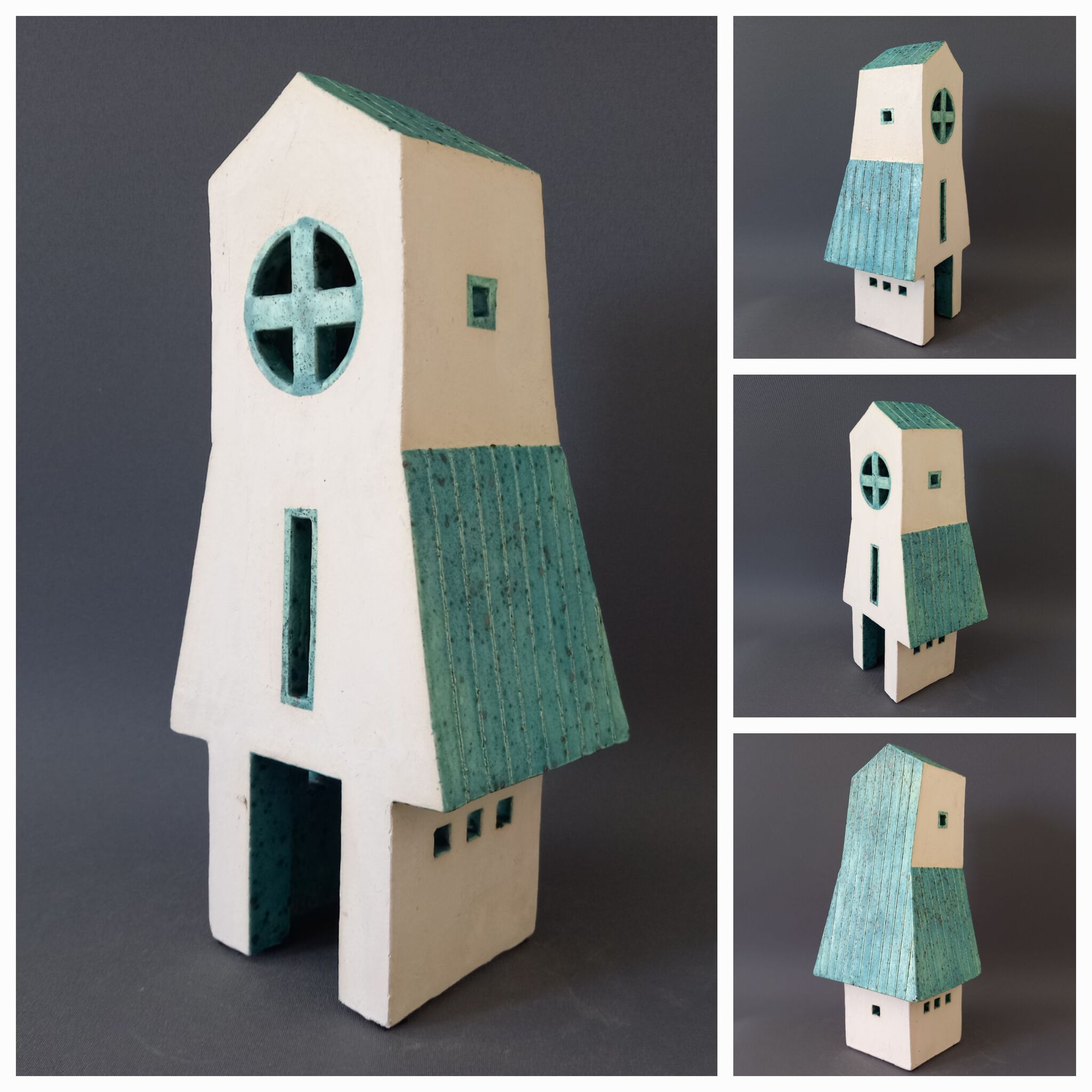 Pagodehuis. Geïnspireerd op de Aziatische Pagode's. Witte klei en een matblauw spikkelglazuur