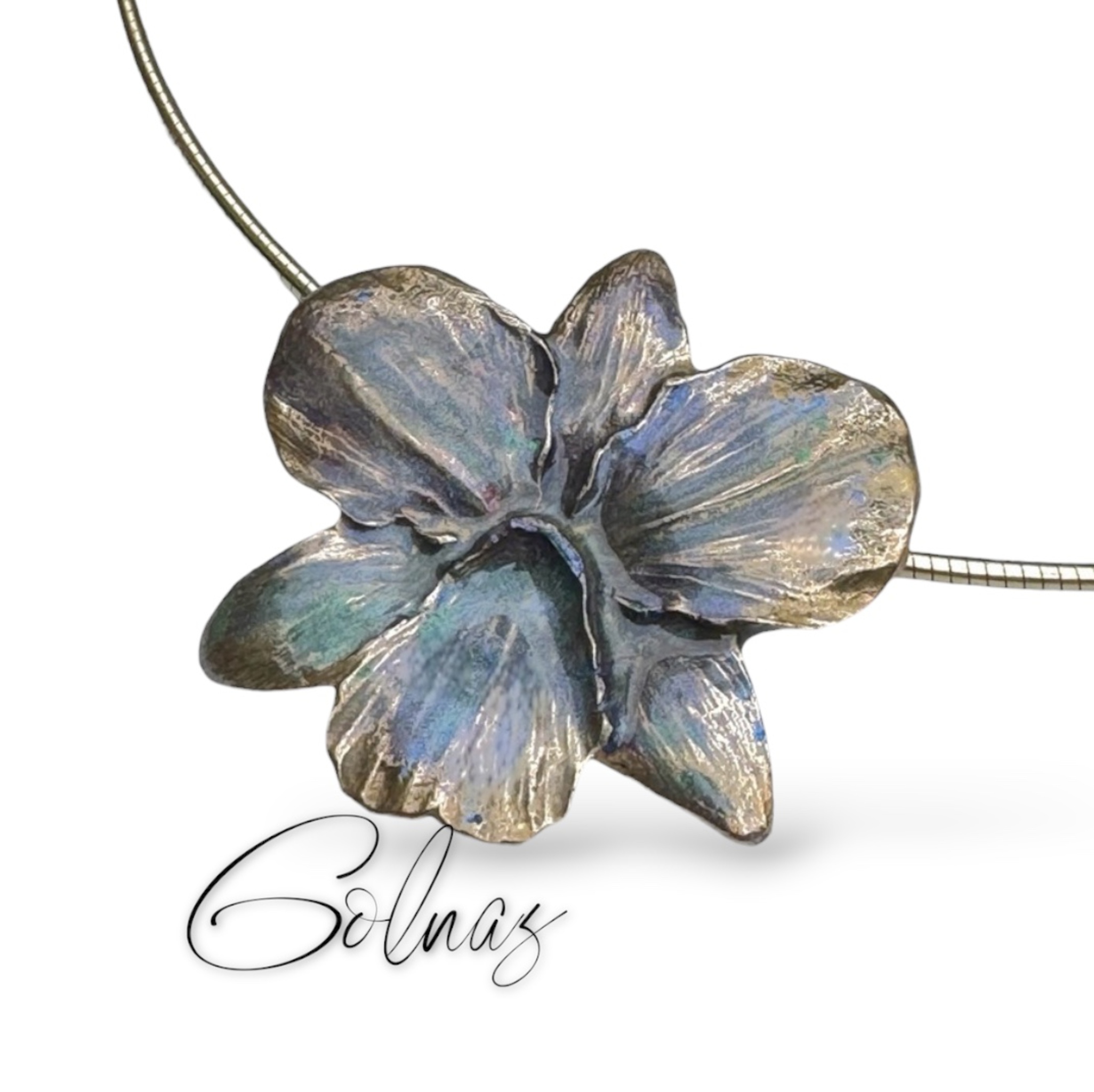 Bronzen hanger, orchidee bloem, aan vergulde zilveren ketting.