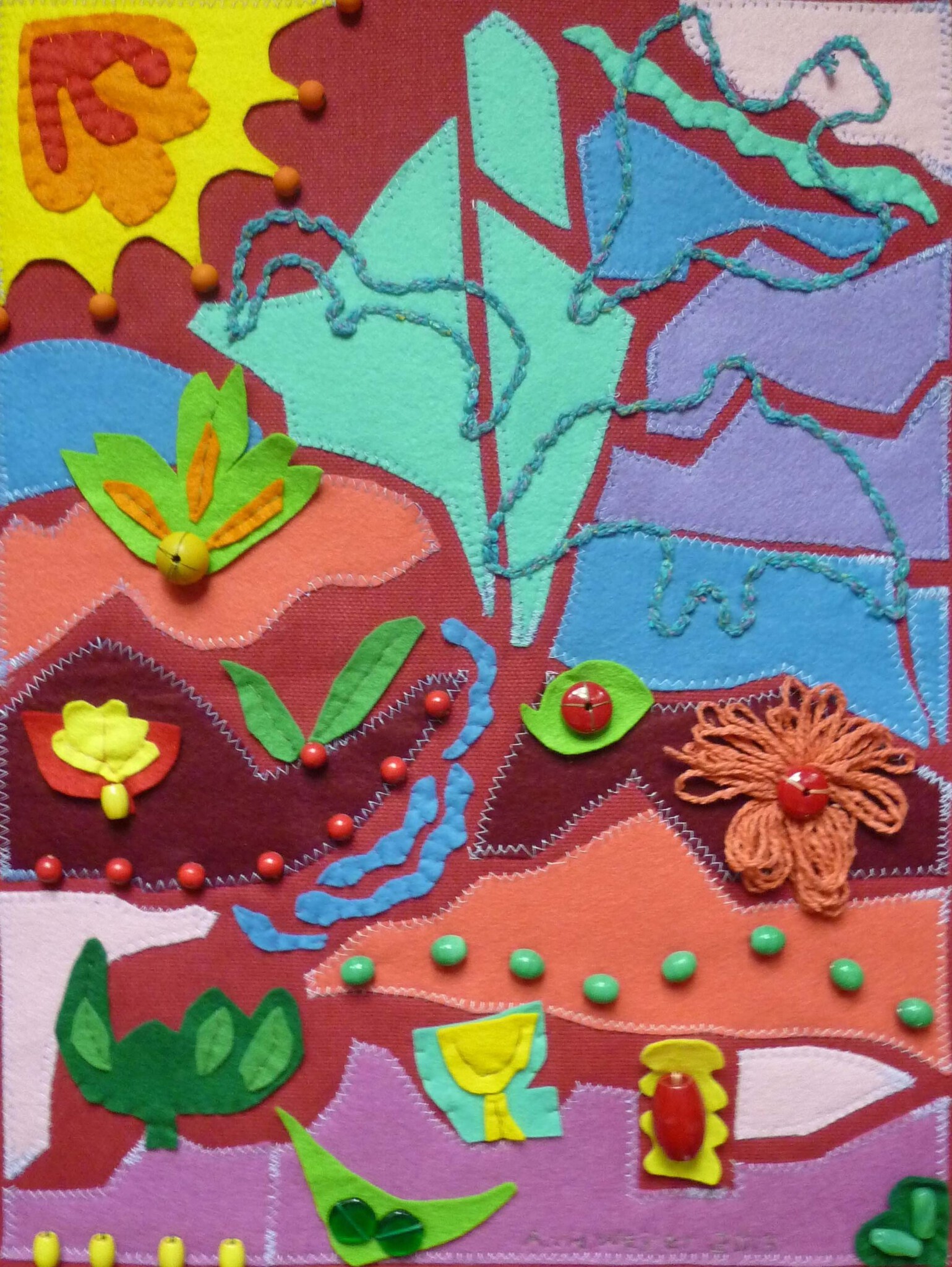 Wandkleed met landschap, gemaakt met onder andere linnen, vilt en houten kralen.