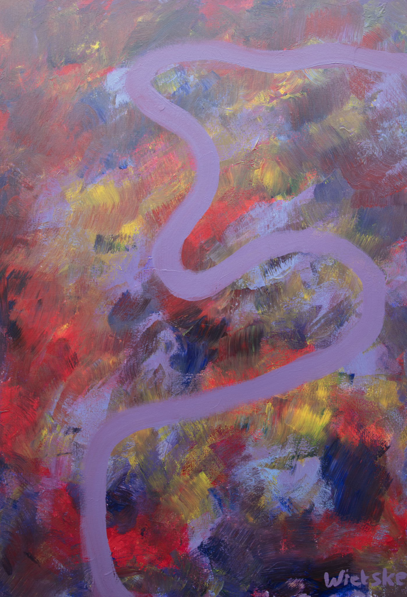 Psalm 23 uit de Bijbel heeft een aparte betekenis voor mij. Toen ik belijdenis van mijn geloof deed was deze psalm de tekst die ik meekreeg. Door de jaren heen is het mijn lijfpsalm geworden in goede en kwade dagen. Het donkere is er maar ook het lichte. De paarse lijn is voor mij de weg die ik in mijn leven aflegde. En die weg was niet recht, maar vaak krom. Toch komt de lijn boven.