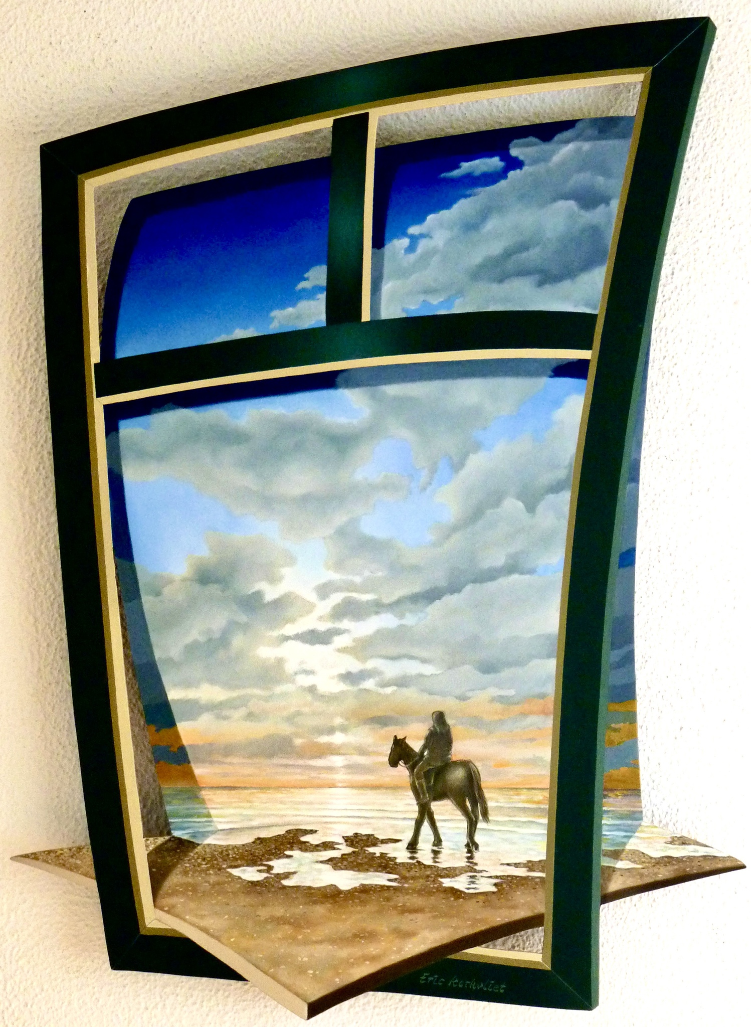 Eric Kerkvliet schildert met olieverf uiterst gedetailleerd voorstellingen op iets verhoogd paneel waardoor bij juiste belichting een Trompe-l’oeil-achtig effect ontstaat.